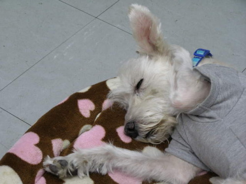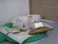 もう、毛が伸びてどうにもならないイヌーピーです。軽いヘルニアとのことで、運動禁止中なのですが、先生に、トリミングは平気?と聞いてみたんだけど、ダメですって。自分で家で刈れないの?ってことだけど、そう簡単には・・・ねね子は家で母が刈っていました。イヌーピーはおとなしくないので、母には断られました。で、ねね子のバリカンをひっぱり出してきたのですが、刃が1mm。S&Pのねね子には1mmでよかったのですが、白のイヌーピーは1mmで刈るとへんなので、3mmなんです。そこで、3mmの替え刃を買おうか、トリマーさんにお願いしようか、悩んでいるうちに、↓このもさもさねむい↑です。ひとまずチャレンジすることにして、3mmの替え刃を買ってみました。早く届くとイイな。