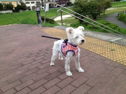 梅雨明け?なのでしょうか。毎日暑いです。この間、お散歩の時の暑さ対策に、何かよい物がないか探していたのですが、お水をしみ込ませて着せるベストがありました。「気持ちよさそー」だなと思い、「これ買おう!」と・・・その時、ハーネスはどうすんねん!って、気がついちゃいました。で、彼氏さんに相談したら、「ハーネスがベストなんだから、水につけちゃえ!」って、ことになり、“冷やしハーネス”早速試してみました。同じの2個もっているから、1個水につけても大丈夫。朝のお散歩から帰ってハーネスを取ると、ハーネスの部分は肌がひんやりしてました。まあ、一部分だけでが、無いよりよさそうですね。