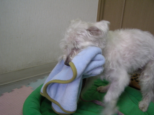 ご機嫌なのか、不機嫌なのか・・・コレ、よくするんです。口に毛布をぎゅうぎゅうに詰め込んで、とっても可愛く「ふぅん~ふぅん~」鳴くんです。おもに、おやつを食べたあとです。それにしても詰め込みすぎじゃない!ぴーちゃん♪