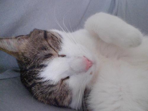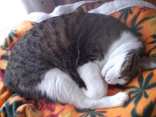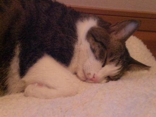 マイ君の甲状腺の病気は、甲状腺機能亢進症と言います。甲状腺ホルモンの分泌が異常に活発になるため体中の新陳代謝も異常に活発になるそうです。だからマイ君は元気だし、食欲もモリモリあります。でもどんなに食べてもどんどんエネルギーを消費するので痩せてしまいます。心臓も働きすぎて肥大化し、呼吸は荒くなります。治療法はお薬でホルモンのバランスを調整するか外科手術で甲状腺を切除する方法があるようですがマイ君は高齢のため、手術する勇気はありません。お薬も腎臓が悪いために、飲ませていいものかどうか今もまだ、迷っています。。。マイ君は寝ている時以外は部屋を ぐるぐるぐるぐる と歩き回っています。意味もなく「わ~わ~」鳴いたりもします。初めはあんまりうるさいので私もイライラしました。今はもう気になりません。マイ君は、病気なんです。元気なのは病気が悪化している証拠なのかもしれません。だからマイ君の寝顔を見るのはとっても嬉しいんです。マイ君がやっと眠れたんだな~って思うからです。でも可愛いな~ってダヤ君みたいに撫で撫でしてしまうとマイ君は絶対にまた起きて動き出してしまうので触らないように気をつけています。そんな病気持ちのマイ君ですが昨日、16歳のお誕生日を迎えることができました。マイ君、もう少し頑張ってね。マイ君、もう少し一緒にいようね。マイ君、お誕生日おめでとう