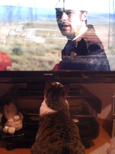相変わらずテレビに夢中のダヤン君今日は映画鑑賞。ブラピですね。こちらは、ケヴィン・スペイシー観たことがある方はわかると思いますが『セブン』のラストシーンです。そして、モーガン・フリーマン3人の迫真の演技にダヤ君は釘付けですこんな難解な映画がわかるのかしかも、字幕・・・(笑)ダヤ君、キミはやはり天才なのかでも、かなり疲れたみたい・・・