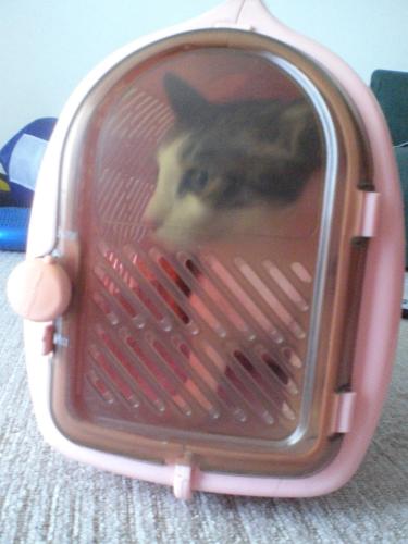 ダヤ君が久しぶりに病院へ行きましたかれこれ4年ぶりだと思います。病院に行くとは思っていないダヤ君ですがいったいどこに行くのかと少し不安そう。。。大丈夫、ただの健康診断だからね。そんな怖い思いはしないと思うよ・・・多分・・・ マイ君が大変お世話になった病院は、とても評判がいいのですが先生がよく変わるので・・・新しい病院に連れて行きました。開業されて1~2年のまだ新しい病院です。優しくておとなしそうな先生でしたがダヤ君をケージから出す時、あまりの重さに「おお~~、大きいなぁ~」と声をあげていました。「す、すいません・・・」体重は、7.5kg。「肥満ですね。」「そ、そうですね・・・」とても丁寧に触診をしていただく間久しぶりで暴れたり騒いだりしないかと心配したダヤ君は驚くほどおとなしく、おまけに太っていることもあって・・・「この子はほとんど動かないんじゃないですか」「あ、いや~これで結構動いたり遊んだりするんですけど・・・」普通の猫はお腹を触ると肋骨や内蔵に触れるのにダヤ君はほとんど触れない状態だそうです結果としては、どこにも異常はみられなかったのですが・・・「でも、肥満は病気ですから。」「はい、そうですね。。。」「食事制限を頑張って続けてくださいね。」「はい、がんばります。」ということで健康診断は無事終了しました。 帰ってから、不満でいっぱいのダヤ君ごめんね~。。。でもとってもいい子だったよ~~~ と褒めたおしてみても暫くはご機嫌斜め でも、やっぱりすごく疲れたようです・・・母(私)子(ダヤン)ともども心してダイエット、頑張ります