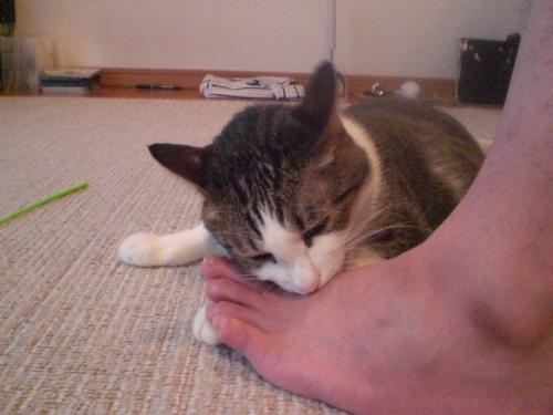 夏は嫌いな Purige ですがスポーツは大好きなのでもうすぐ始まるオリンピックが楽しみでなりません全競技リアルタイムで観たいのですがそんな無謀なことをしたら仕事でびっくりするような失敗をしそうなのでどうしても生で観たい競技を吟味してオリンピック観戦スケジュールを組んでいこうと思っています。皆様は何の競技に注目されているでしょうかと、すっかり話は変わりますが・・・ダヤンが近頃ハマッているものがあります。はい、これ、旦那の足です はっきり言って、(旦那に)手で触られても「足、プリーズ」とはっきり要求します噛んでいるのは、まさに要求中ということです。足でうりゃうりゃして欲しいのです。Purige には 「足、プリーズ」 要求はしません旦那は足の親指が大きいのでなんかわからないけど、とにかく調度いいみたいです 旦那いわく、恍惚の表情で転がるそうです旦那が歩いていると手で止めてでも足を要求します手で止める=噛む ・・・なのですが旦那は喜んでいるようです