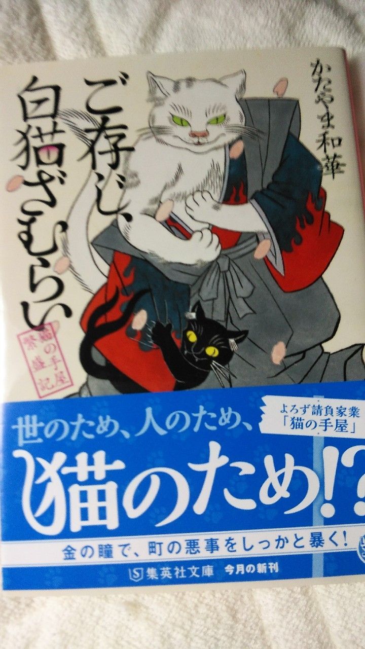 今日も良い天気! なのでお昼頃2時間くらい屋根の上で布団干し!こんなチャンスは次いつかわからないからねぇ。 ご存じ白猫ざむらい 猫の手屋繁盛記6 かたやま和華著 集英社文庫 を、読みました。 ここで白猫ざむらいの父上登場! なぜか入れ墨のお奉行様!? 近山銀四郎!ハハハ 人間サイズのもふもふ白猫! ワタシも触りたい!