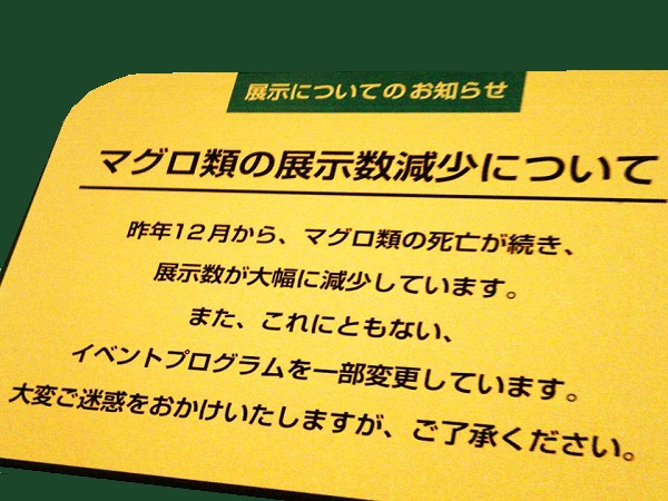 昨日の夕方テレビのニュースから聞こえてきたのは、聞きなれた名前でした。葛西臨海水族園そう、ボクらのホーム水族館です。ニュースの内容は衝撃的でした。マグロの大量死なんと!!葛臨の目玉のお魚です。ニュースに動揺させられて、本日、勤務後に様子を見に行きました。お知らせが書いてありました。大幅に減少本当に減っていました…小さい頃から現在まで20年以上、大水槽のこんな姿!!見たことなかったです…恐怖を感じる光景です…今まではこんなにたくさんいました。過去と現在を見比べてみましょう。これで行った事ない方もわかると思います。寂しい水槽の姿を…この大水槽には3種類のマグロの仲間がいます。・クロマグロ・スマ・ハガツオ2014年12月1日には3種類の合計で165匹いました。しかし本日ボクらが数えた結果…クロマグロ…13匹ハガツオ…8匹スマ…1匹ハマダツ…1匹!!なんと合計23匹!!マグロの仲間ではないハマダツがいましたがwすでに6週間で142匹の…マグロたちがお亡くなりになっています…スマはもう残り1匹です!!最後の1匹に会う事が出来て、嬉しいやら悲しいやら複雑でした。本日撮影した最後のスマです。こちらは残り8匹のハガツオ達です。そしてこちらが…何故か紛れてるハマダツくんですwさらにこちらが…残り13匹のクロマグロです。顔の周りに病的なデコボコが目立ちます。異様な泳ぎ方をしている子達もいました。現在も原因は不明ですが…ボクは、大水槽の近くで始まったリニューアル工事、これがカギの様な気もします。最悪の場合…今月中に全滅してしまうかもしれません。クロマグロなどは生きたまま捕まえるのはかなり難しいそうなので、かつてのように大量のマグロが泳ぐ姿は…しばらく見ることが出来ません…。とても悲しいです。 ボクらの一番よく行く水族館なので、 かなりの愛着があります。 また元気なマグロ達が見れる日を、 願ってます!! 引き続き状況を見守りたいと思います。 何しろ我らがホーム!! 年パ持ってるもんね♪