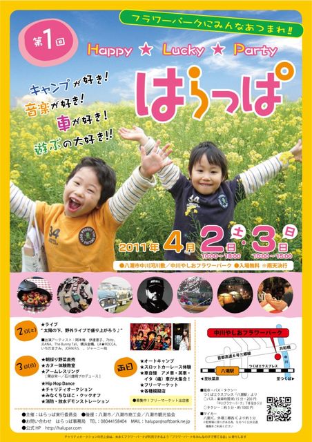 平成23年度第一回「はらっぱ」は震災の影響で、中止となりましたが八潮市や三郷市に避難されてる方を招いて「被災者慰安 and チャリティー模擬店」で、ひと時を一緒に過ごしました。協賛金などは、支援物資に変え被災地に届けたりしました。で・・・今年24年度平成24年3月17日(土)~ 18日(日)【第2回はらっぱ開催決定】八潮市観光協会は今年念願だった法人設立し、「花桃まつり」をその記念事業として取り組んでおられます。また八潮市も市制40周年記念事業としてとらえられており、3万人のご来場を目標としております。はらっぱは今回、八潮市観光協会様の「花桃まつり」と共催という形で行います。ごあいさつにもありますが、八潮という街を、広く・深く知っていただけるようなイベントを目指しています。昨年の第1回は震災の影響により、止む無く中止となりましたが、第1回に引き続き横浜銀蝿のリーダー嵐さんのスペシャル出演も決定しました! ライブや軽トラ市やカヌーレース・・・イベント盛りだくさん♪詳しくは、はらっぱホームページを見てね☆http://halupar.com楽しみ~☆