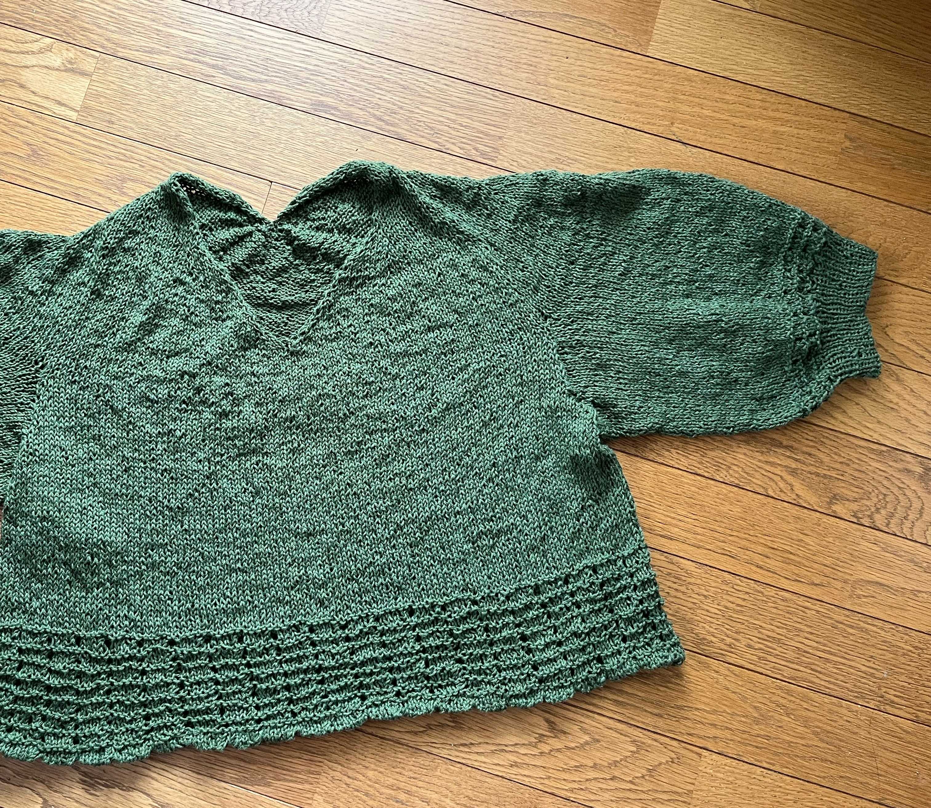 襟回りが脳内予想より大きくなったので、ゴム編みをつけるかかぎ針で数段編むか、