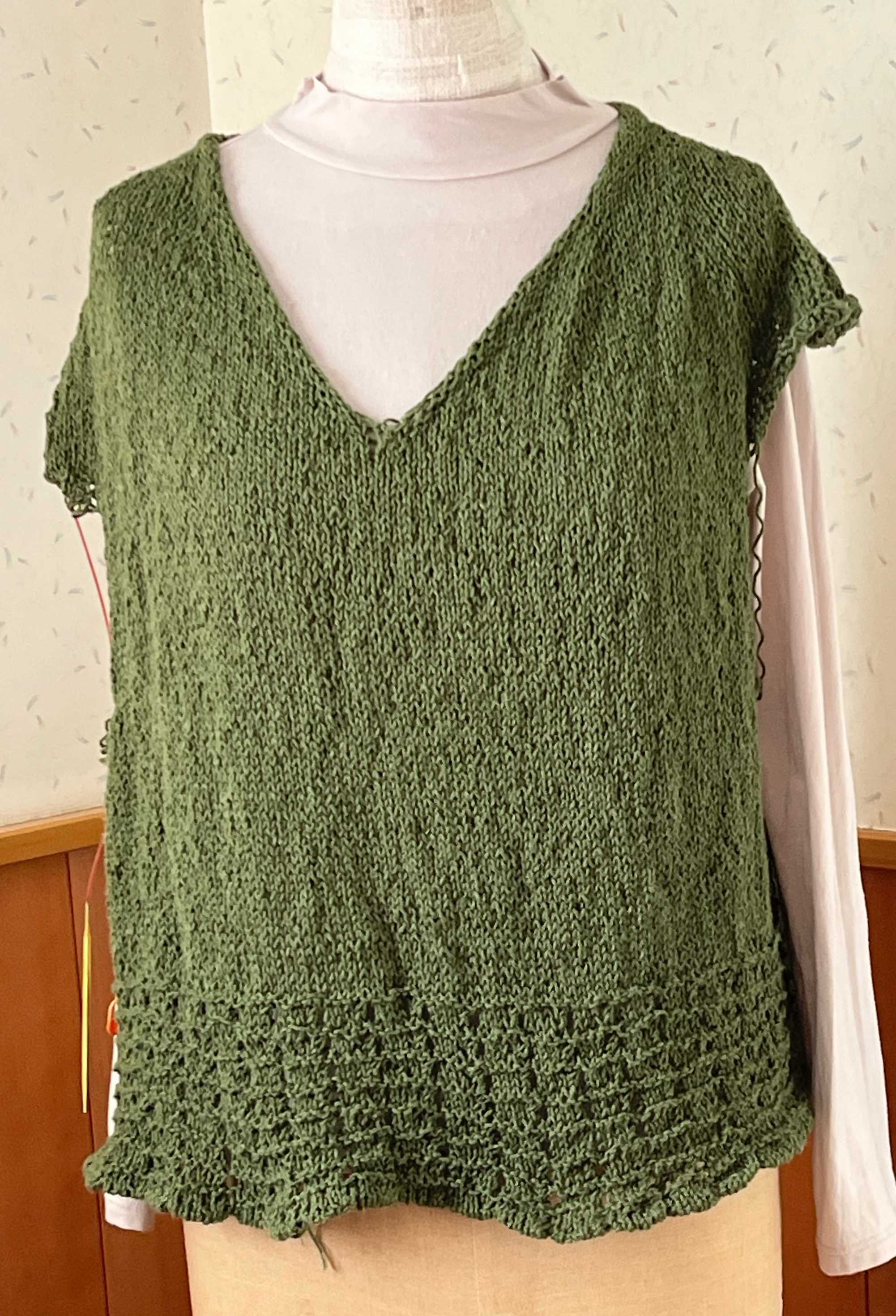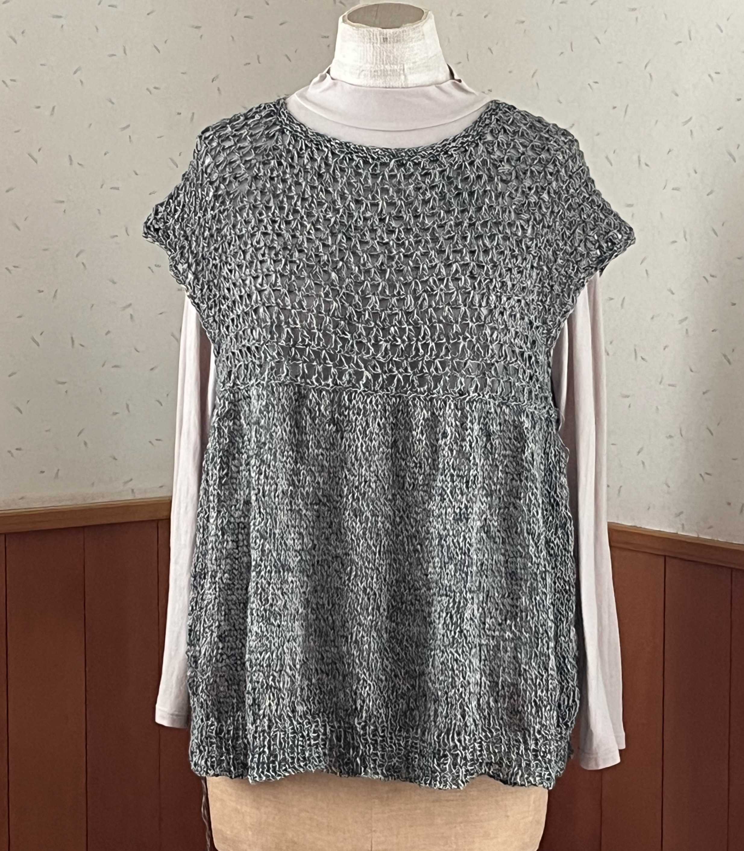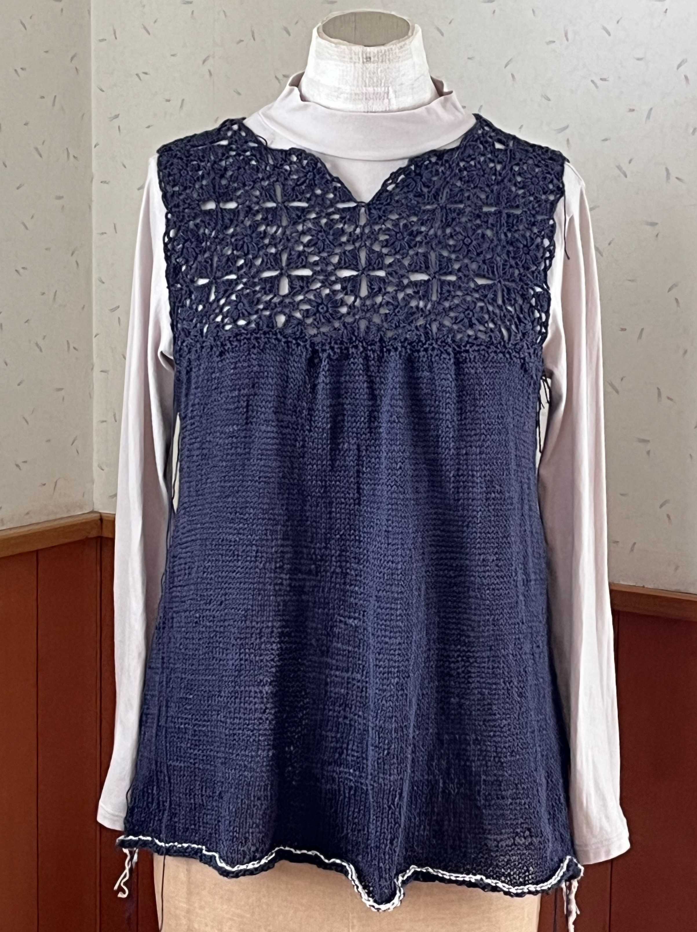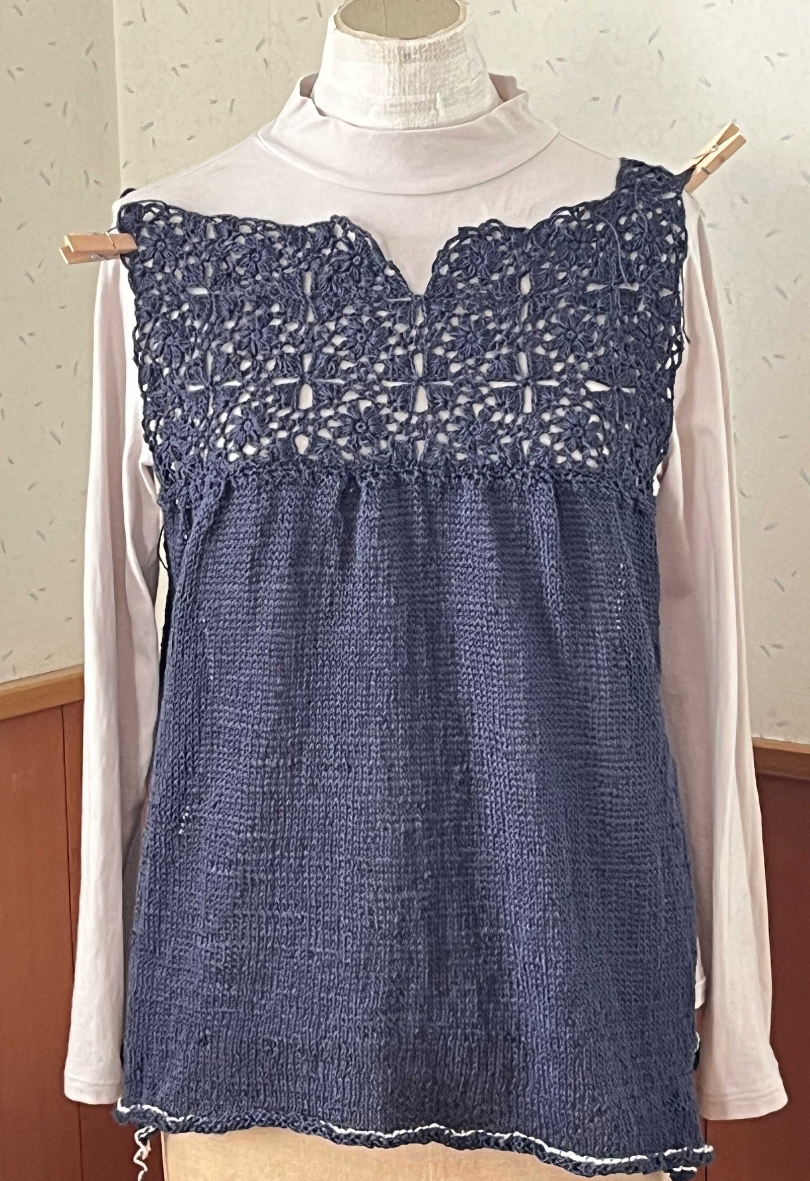 左右のカギモチーフ部分を繋ぎ終えました。左右がもっと下がるかと思ったのだけれど、さほどではなく、よかった。自分用なので,試着。うーん。。トルソーさんだといい感じにギャザーが寄っていますが、私,自分で思う以上に巨大化が進んでいたようで、着られるけれど、フォルムが違う。脇に配置したモチーフ、ヨーク部分よりわざわざ小さくしたものを使ったのですが、そのままの大きさのものにすればよかった。ま、着られるし、脳内の仕上がり図とは違うけど、このまま進めます。ただ、すその仕上げに迷って試行錯誤中。ガーターも違うし、ゴム編みも違うかな。ギザギザにしようか。悩みながら進めます。糸はこの前のタイプ。【578N】ビューティーシルクUV コットン シルク 毛糸 合細-中細 UVカット 編み物 手芸 夏糸 毛糸ピエロにほんブログ村