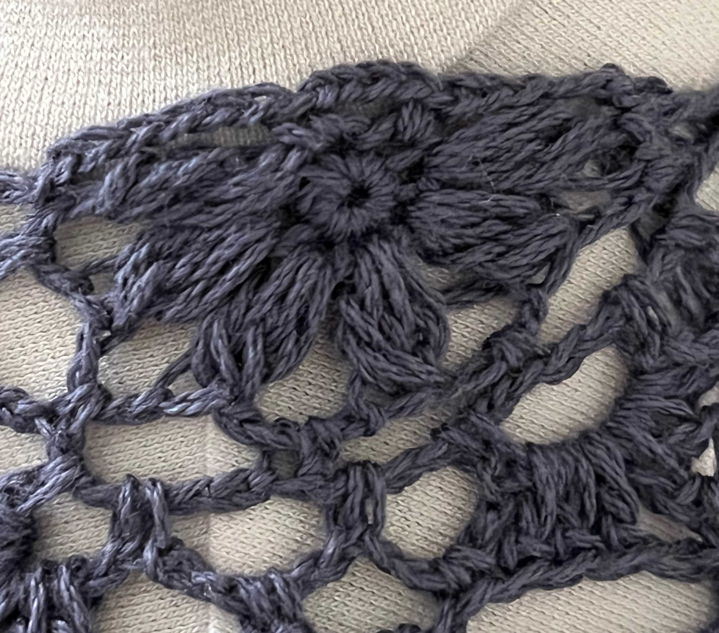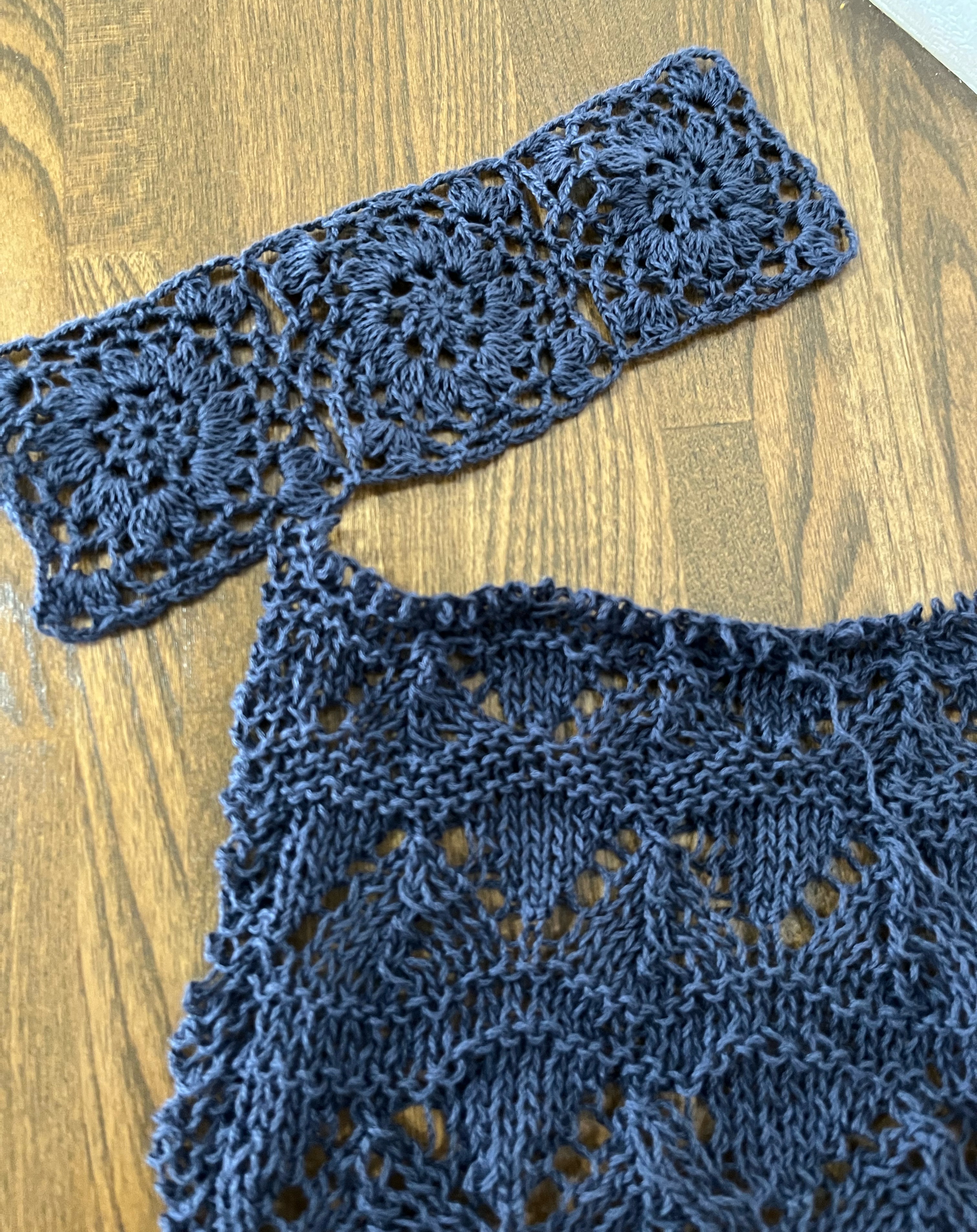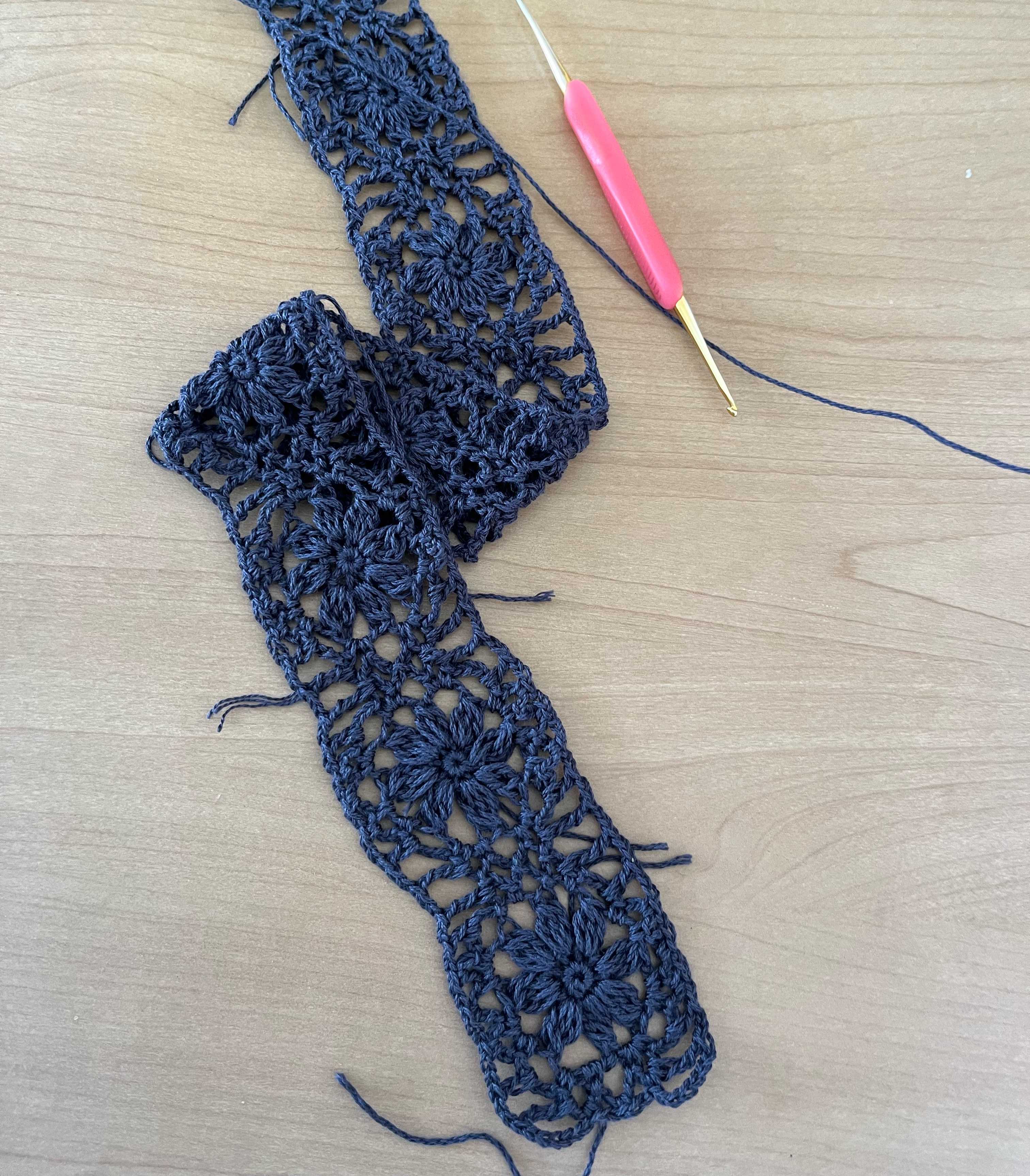 メリヤス部分を編んできて、そろそろいいかなとかぎ針編みモチーフ部分に。ちょっとだけギャザー寄せてかぎモチーフとつなぎます。ちょっとギャザーがいまいちかな。でもこのまますすめます。【578N】ビューティーシルクUV コットン シルク 毛糸 合細-中細 UVカット 編み物 手芸 夏糸 毛糸ピエロにほんブログ村