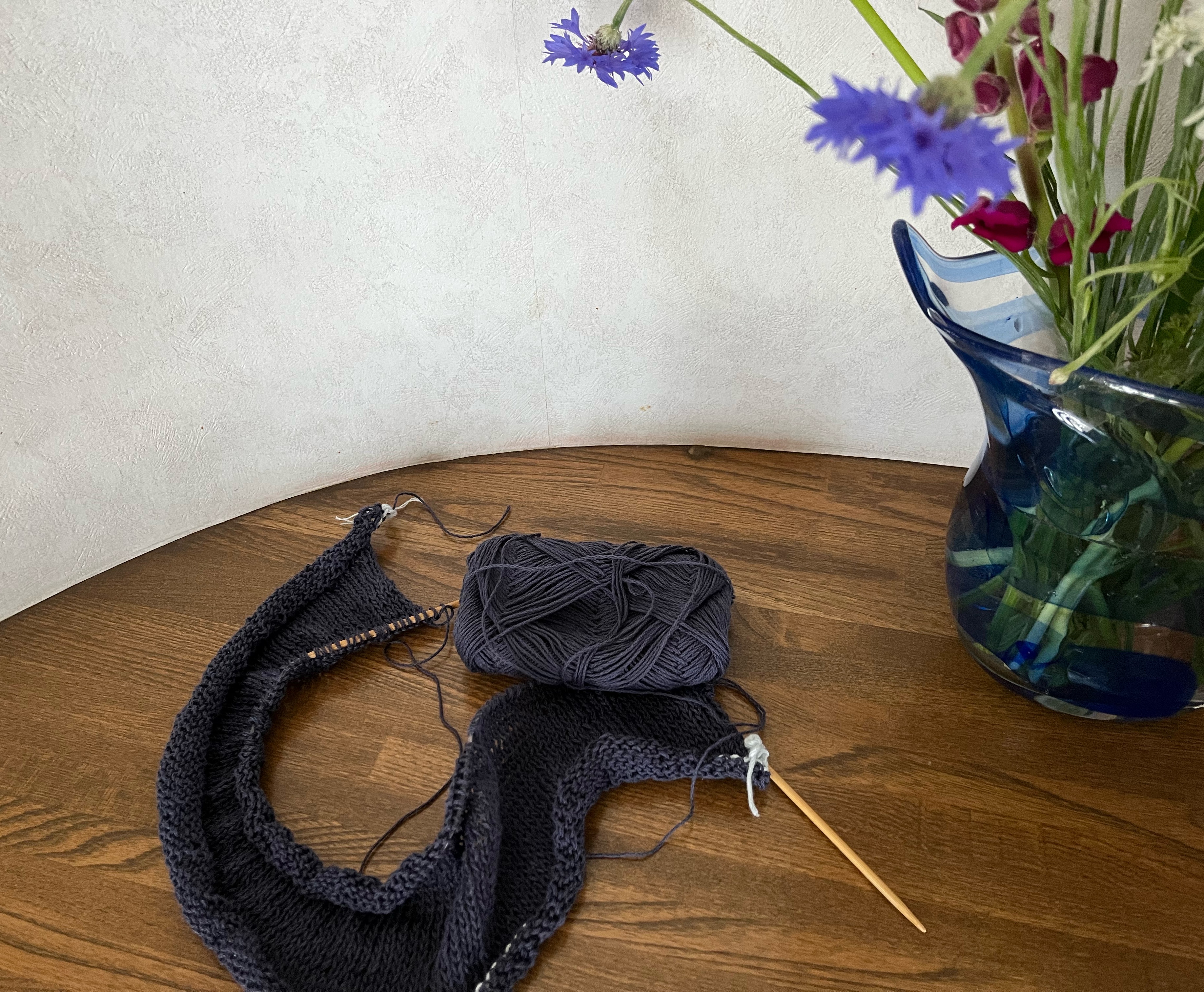 このくらいまで進みました。袖分けして脇下つないだのでもはや10方向ではありませんが。後ろは10方向に編み出した感じがわかるかな。円を12等分して2ピース切り取った形で編み始めています。首の後ろ、ぼんのくぼ辺りから編み始めて,睡蓮の葉の形に増し目しながら大きくしていき、睡蓮葉っぱの切れ込み部分が前身頃の鎖骨のあたりになるまで進んだら、えりぐりになるように中央に向けて増し目して左右合体してVネックに。この後少しずつ増し目するか、あとはストレートにするか、様子を見て進めます。ハマナカ フラックスK 麻糸 リネン 綿糸 コットン 並太 サマーヤーンにほんブログ村