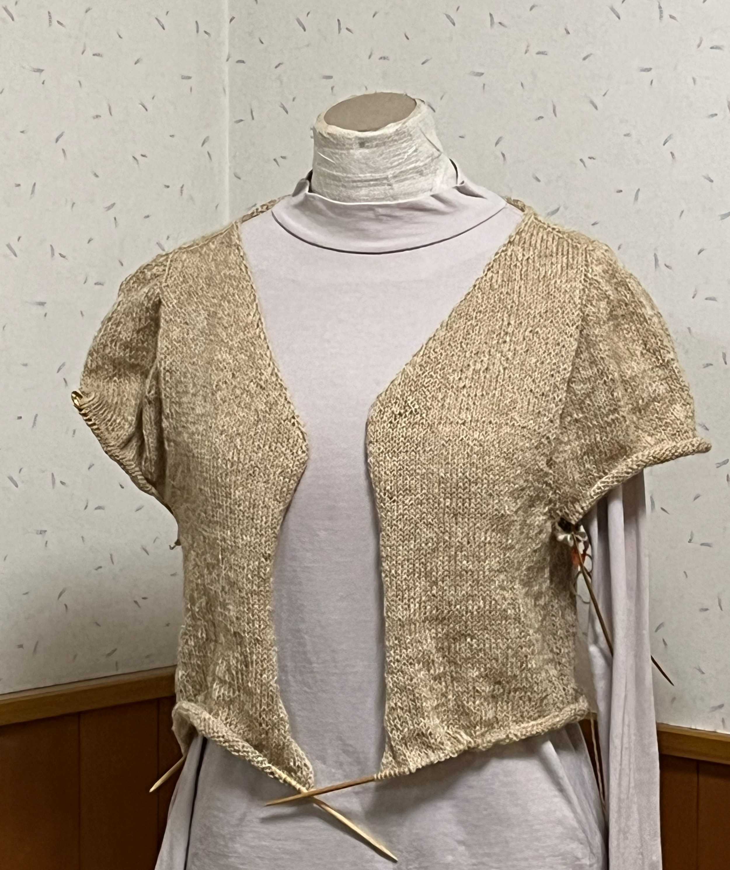 かぎ針で△連続模様の後、お腹あたりで棒に切り替えてメリヤスでちょっとギャザー寄せて編み進めていたものなのですがこんな感じで止まりました。トルソーさんだとこれはあり、かもなのだけれどLめなサイズの私では、なし、が決定したのでここでほどきます。棒針抜いて実験終了決定、の写真。次に編みたいものができてしまったのでこれはしばらく放置かも。職場の人が着ているもので、背中心から編み出しているものがあったので、目コピーではじめます。次に使う糸はこのあたり。サマーヤーン 春夏糸 ハマナカ フラックス Flax Cにほんブログ村