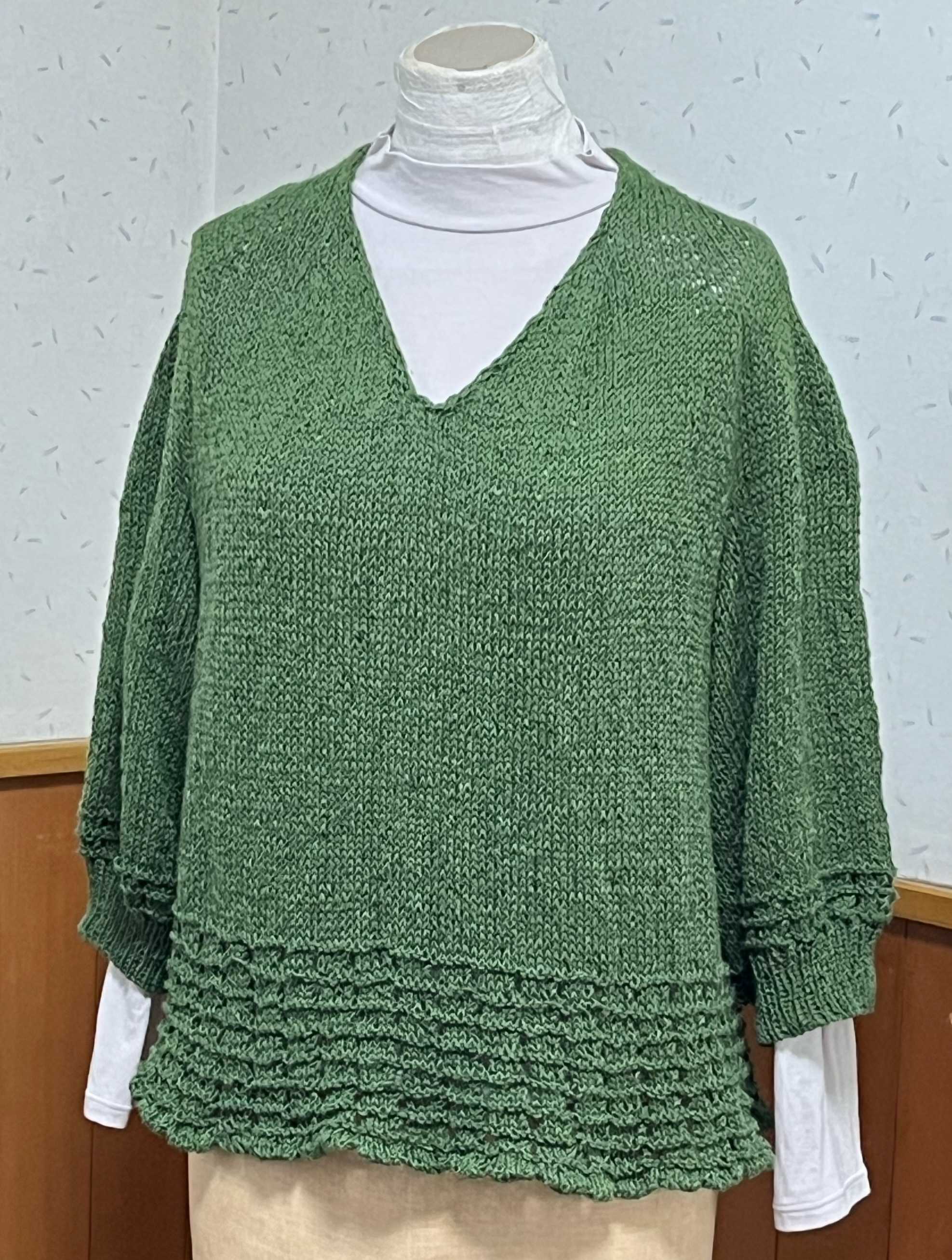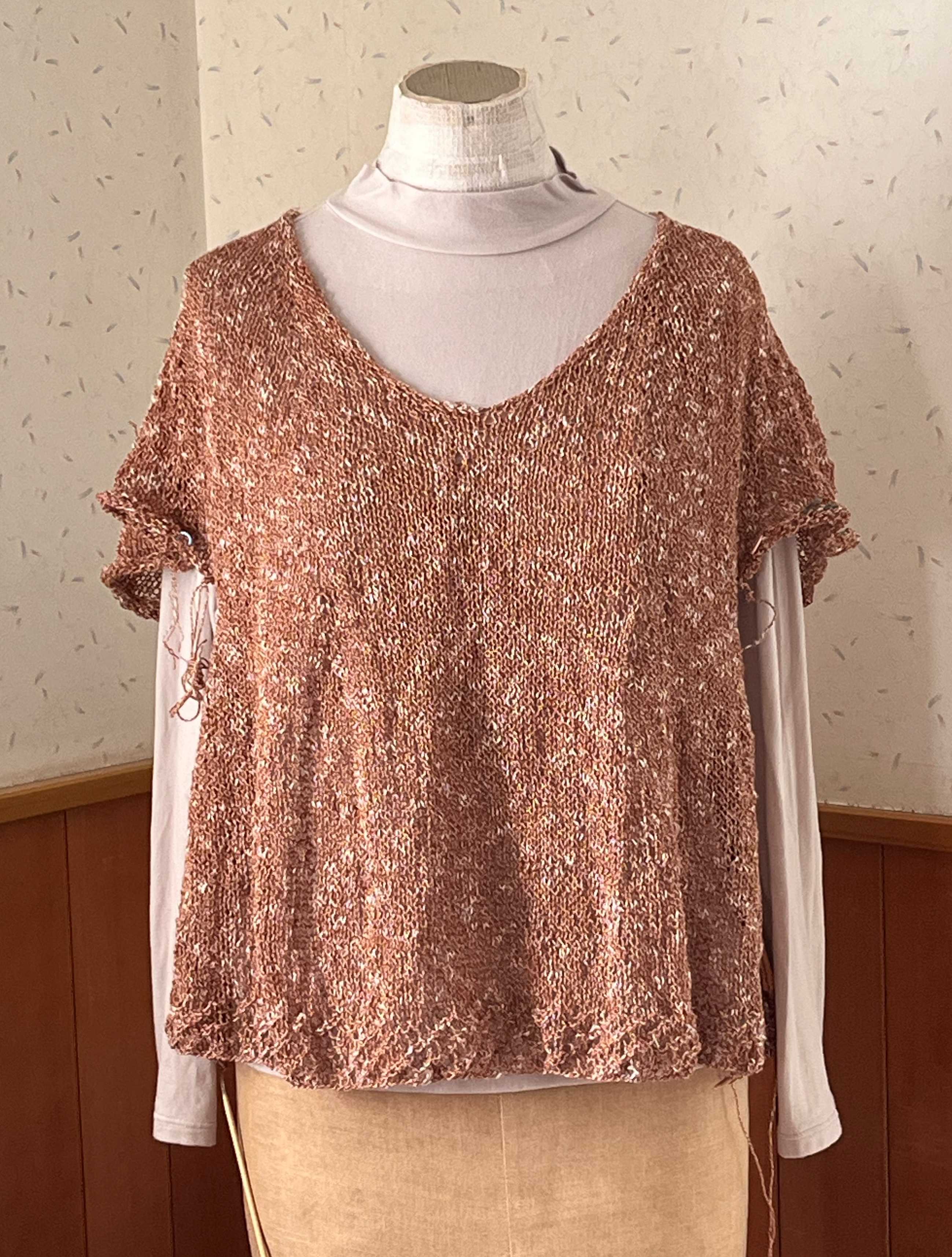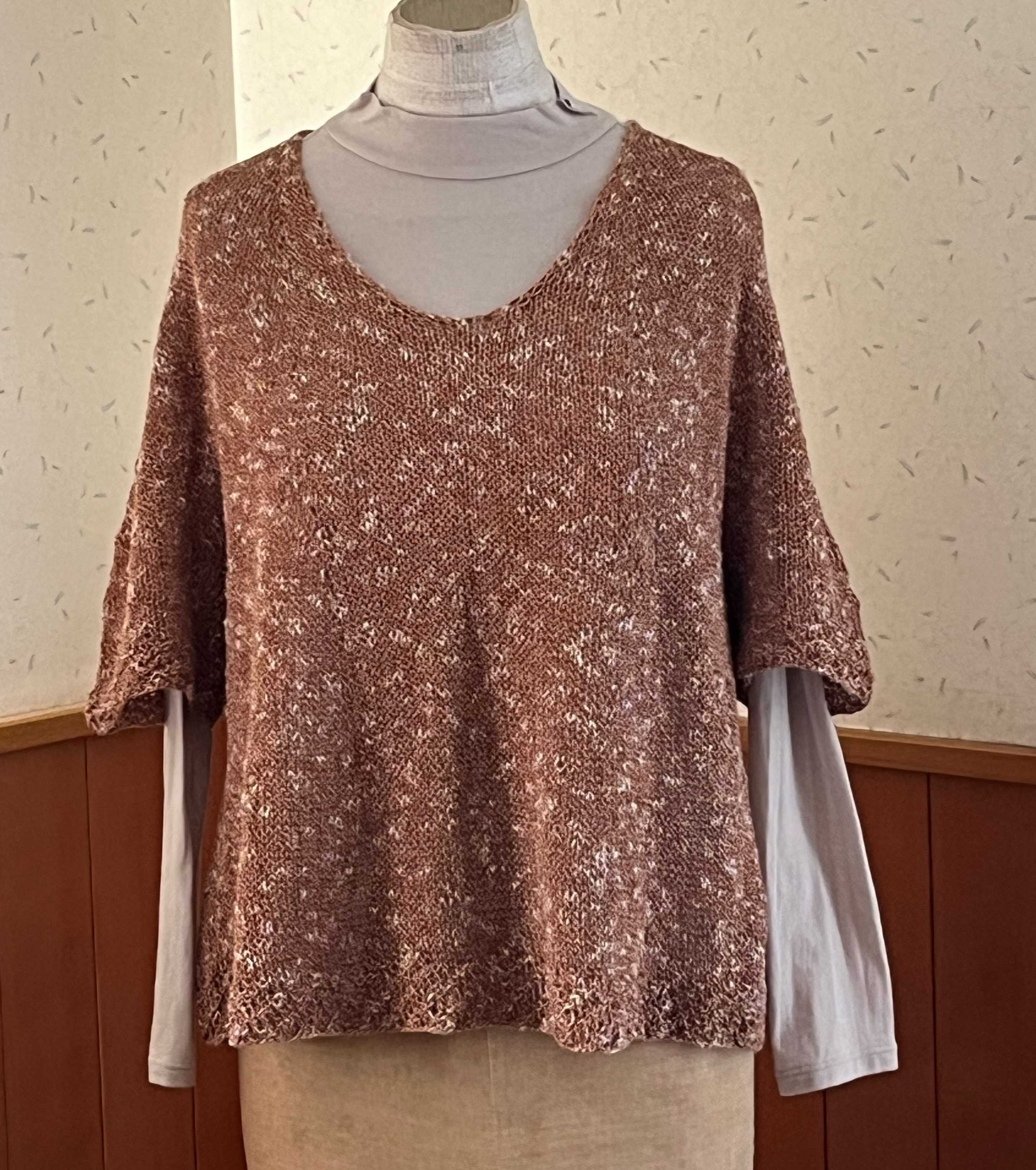 首の後ろ11目から始まったプル、編みあがりました。糸始末がまだですが。トルソーさんはMサイズで、私はLなので、私が着ても写真のようなドレープは出ません。さらっとして着心地いい。袖は肘までかくれるし、下に着るのがキャミソールでも長袖でもいけるので、使える時期が長そうです。裾と袖のエンドは二目ゴムの一目ずらし。斜めに縞にしています。全体の増やし目加減もよかったんじゃないかな。忘れないうちに同じような感じでもう一枚編みたい。ハマナカ フラックスK 麻糸 リネン 綿糸 コットン 並太 サマーヤーンにほんブログ村