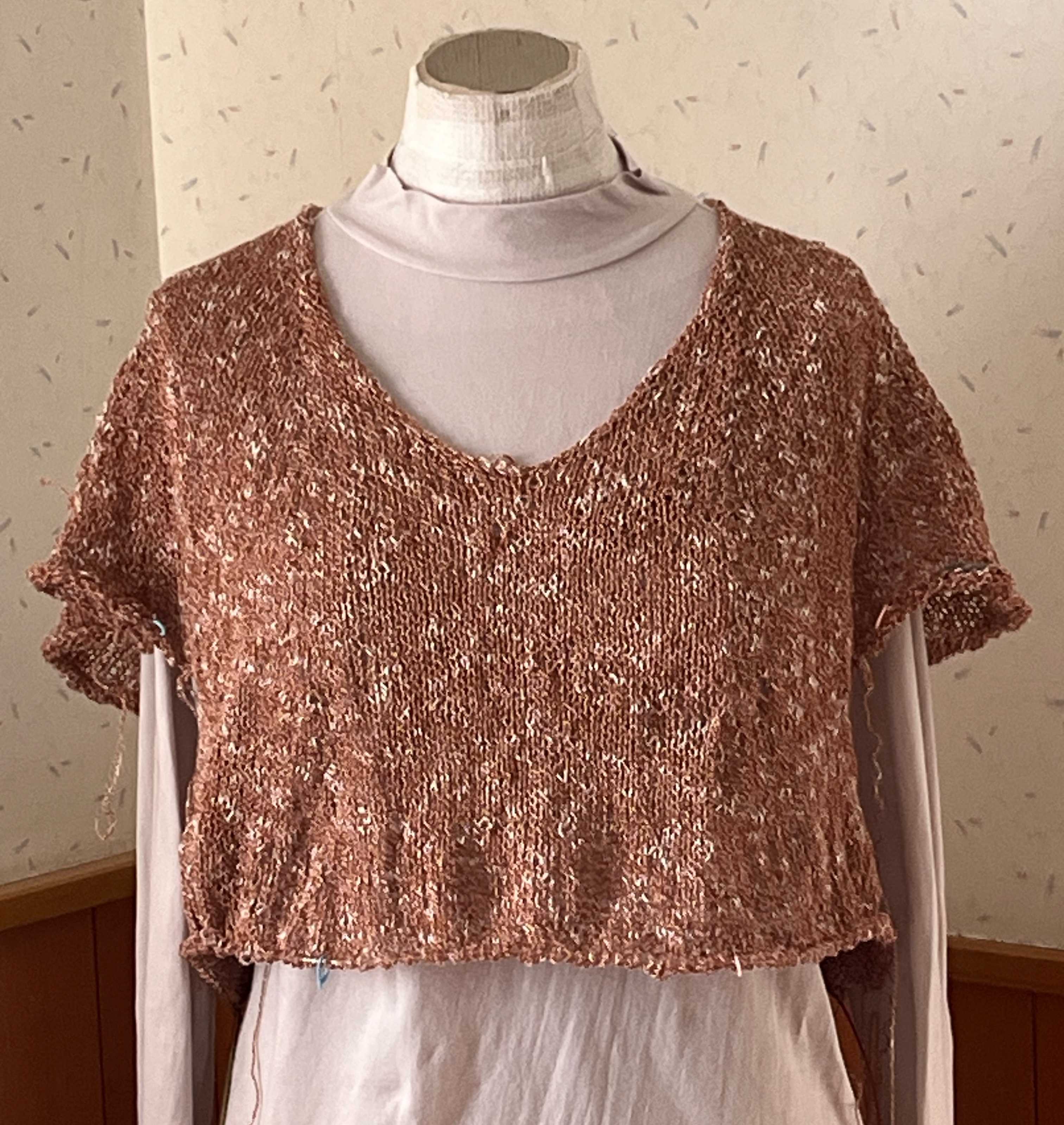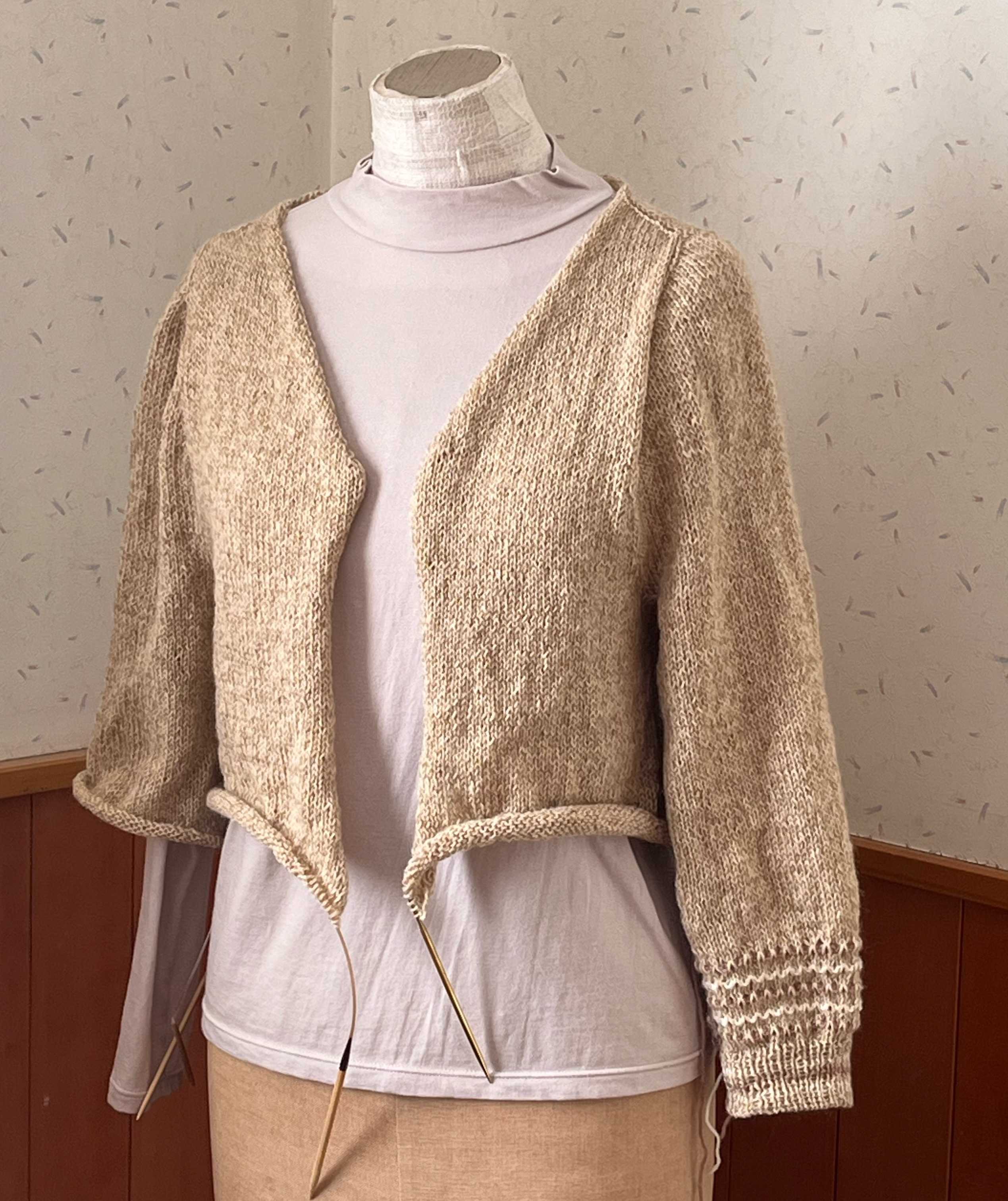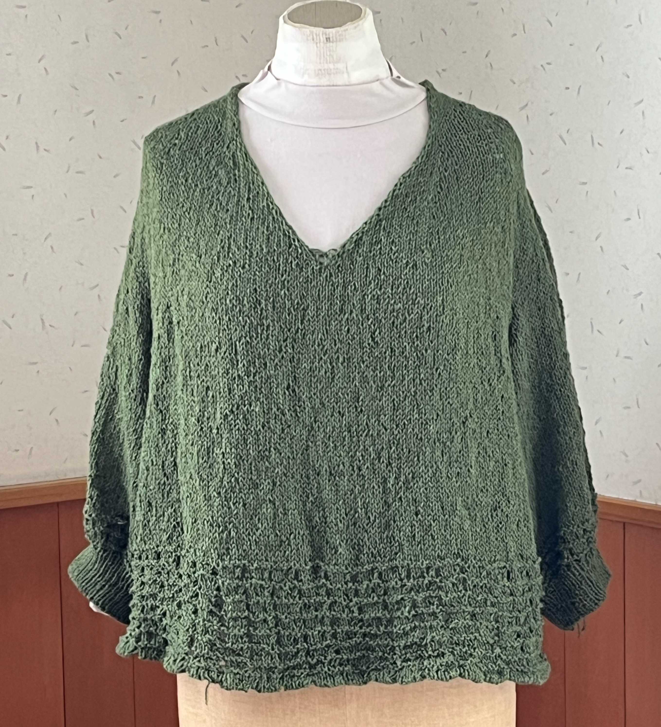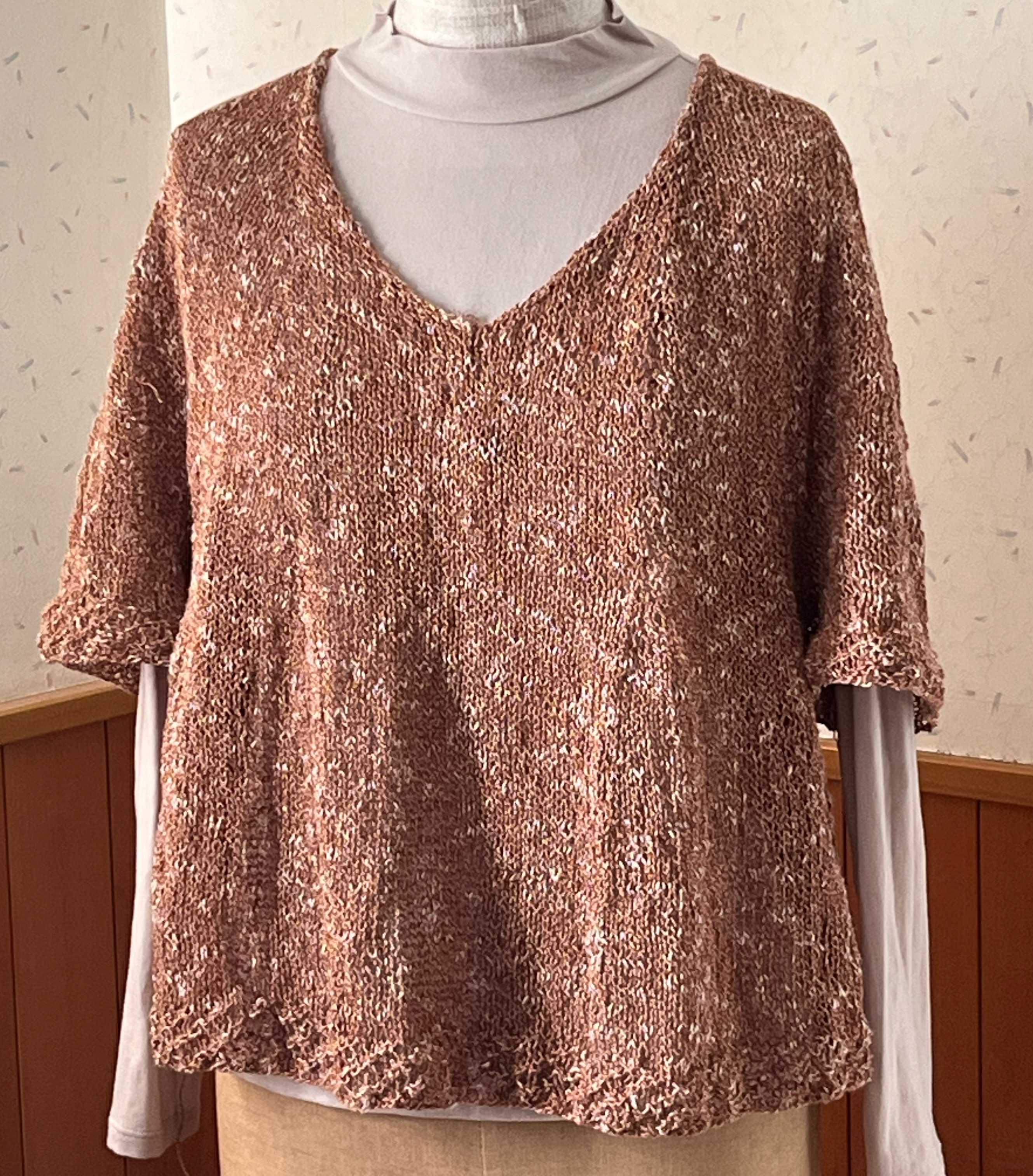 首の後ろ11目から始まったプル、編みあがりました。糸始末がまだですが。トルソーさんはMサイズで、私はLなので、私が着ても写真のようなドレープは出ません。さらっとして着心地いい。袖は肘までかくれるし、下に着るのがキャミソールでも長袖でもいけるので、使える時期が長そうです。裾と袖のエンドは二目ゴムの一目ずらし。斜めに縞にしています。全体の増やし目加減もよかったんじゃないかな。忘れないうちに同じような感じでもう一枚編みたい。ハマナカ フラックスK 麻糸 リネン 綿糸 コットン 並太 サマーヤーンにほんブログ村