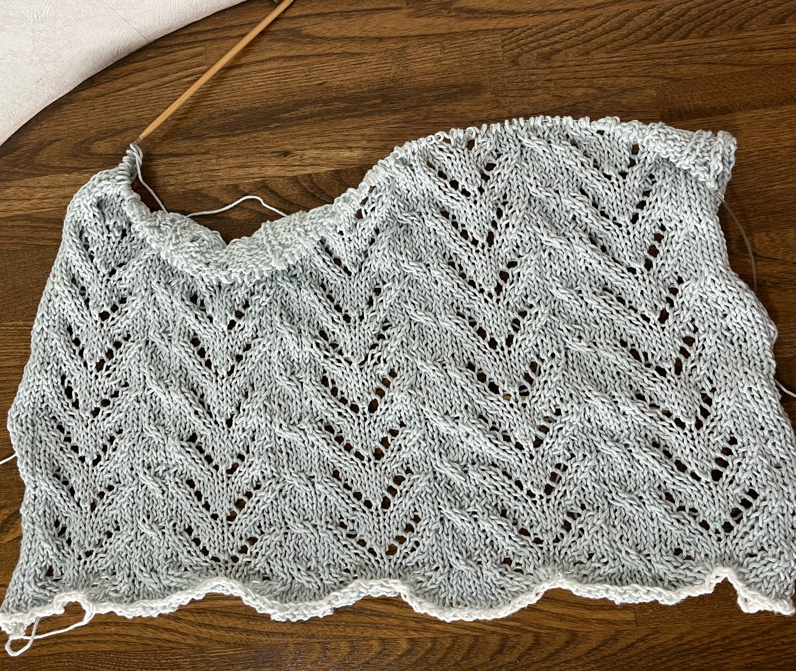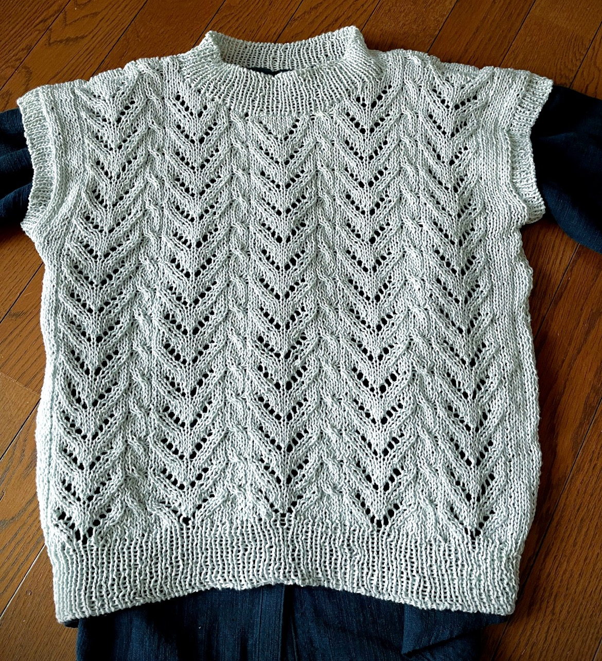 首の後ろから10方向に編み出したプル、綿化繊版、ほぼ編み上がってこんな感じ。襟回りが脳内予想より大きくなったので、ゴム編みをつけるかかぎ針で数段編むか、またはこのままでいいかちょっと悩んでいます。床置き。 袖の様子がわかるかな。裾の模様を袖には2段だけ入れました。編みなおし糸だし綿だしで、洗ったら色々変わってくると思います。どうなるかな。模様はこの本から透かし模様280増補改訂版 棒針編みのレース模様280とすぐ編める小物11点にほんブログ村