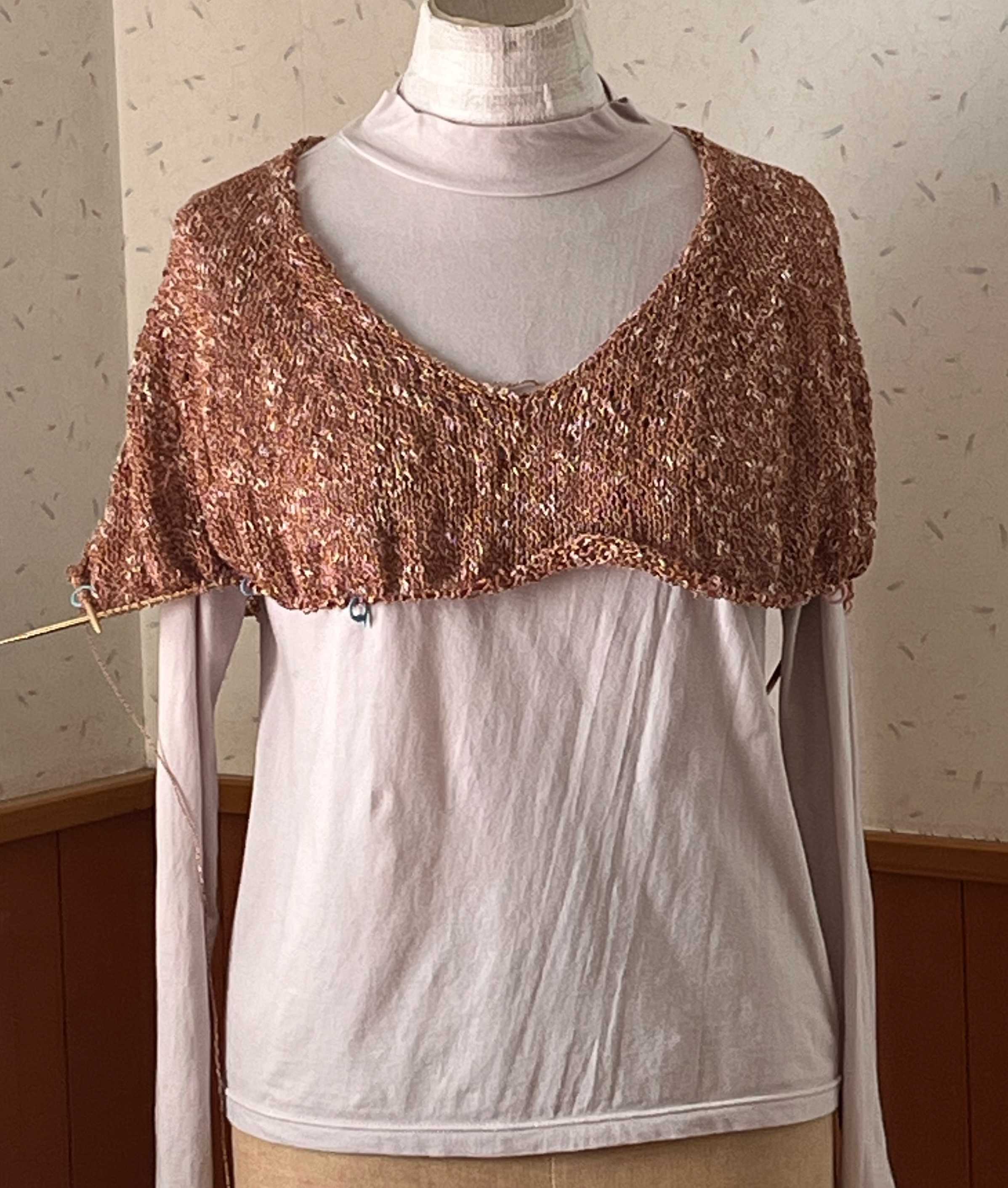 ダイソーのストレッチループ,トップダウンで編み始めて、2玉でここまで。袖分けするところです。様子が見たくて輪針がジャラジャラしています。思ったより糸が長くて、この形状なのでどこで糸を繋いでも大丈夫なので,そもそもコスパいいのにさらにいい。何玉でできるかな。にほんブログ村