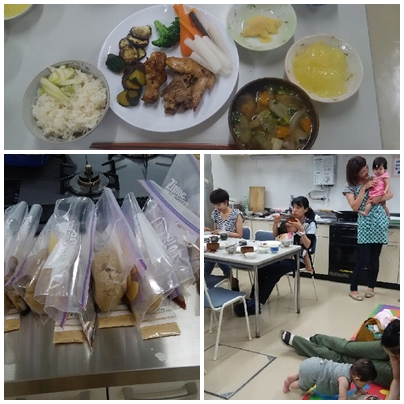 初めて料理教室で肉を食べました。照り焼きとしょうが焼き、そして豚汁。う~ん、食べすぎ。左下はお土産です。糠床、しょうがの甘酢付け、きゅうりのカリカリ漬けと、今日は盛りだくさん。食べ終わった人から赤ちゃんと遊んだり、抱っこしてもらってお母さんはゆっくり食べたりと、料理教室というよりも、お昼ご飯を食べにきたみたいな写真になってしまいました。デザートは晩柑のゼリーです。シナモン、クローブ、カルダモン、しょうがの絞り汁、レモンの絞り汁を入れてさっぱりと。これからの季節はゼリーが美味しいですよね。ゼラチンより寒天をお使いください。家で作ったゼリーは安心でやっぱり美味しい。