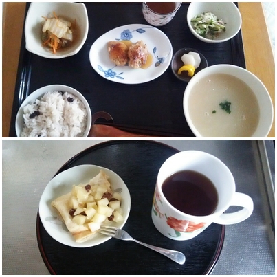 今日の昼食メニュー・黒豆ご飯 ・ジャガイモのピューレ入りスープ・大根餅・白菜と人参の煮浸し・切干大根とゴーヤの酢の物・大根の糠漬け、パプリカのピクルス今日のおやつメニュー・リンゴとレーズンのスパイス煮のせ クレープ・紅茶季節ではない野菜もあったりしますが、冬に夏野菜を食べるよりはいいのかな?今日もどのおかずにも生姜が少しずつ入っています。クレープにのせたリンゴとレーズンには生姜を入れすぎて少しスパイシーになってしまいました。酢の物にはきゅうりが少し入っていますが、塩もみをしてあります。残りのきゅうりは夕飯のおかずに使いましたが、こちらは炒めました。産後の方にお出しするので、バリバリの生野菜をそのままというおかずはありません。