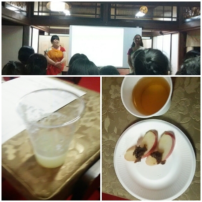 昨日は、Asian Passion Vol.24 6/27 香取薫さん 佐藤真紀子さんの 「アーユルヴェーダ笑学トーク」に参加して来ました。このお二人の話が面白くないわけがないのに、タイトルに「笑学」ってついてるし、期待に胸を膨らませて広尾まで行ってきました。到着するや否やいただいたのは、左下のジュースは冬瓜のジュース。体を冷やす作用があるので、40人以上も集まったエアコンの無い部屋の中にいっても全く苦痛じゃなかったのです。ついたばかりは汗だくだったのに、途中から「そんなこと言って、実はエアコンあるんじゃないの?」と探してしまったぐらい。こんなにも体を冷やすんだと、いい体験をさせてもらいました。そして休憩時間には右下はリンゴに薔薇のジャムをのせたものと、緑茶とミントのブレンドティ。美味しくて、しかも体がラクになるってことを、私たちは知らなすぎますね。文明の利器に頼りすぎて手っ取り早く不快を解消しにかかるからなぁ~。お二人の話はパンチャカルマといかに体に毒をためないようにどう生活するかという基本中の基本の話でした。これからは「いいウ○チ」がビジネスになるとかならないとか。ビジネスにならなくても、いいウ○チが出せるような生活をしたいものです。