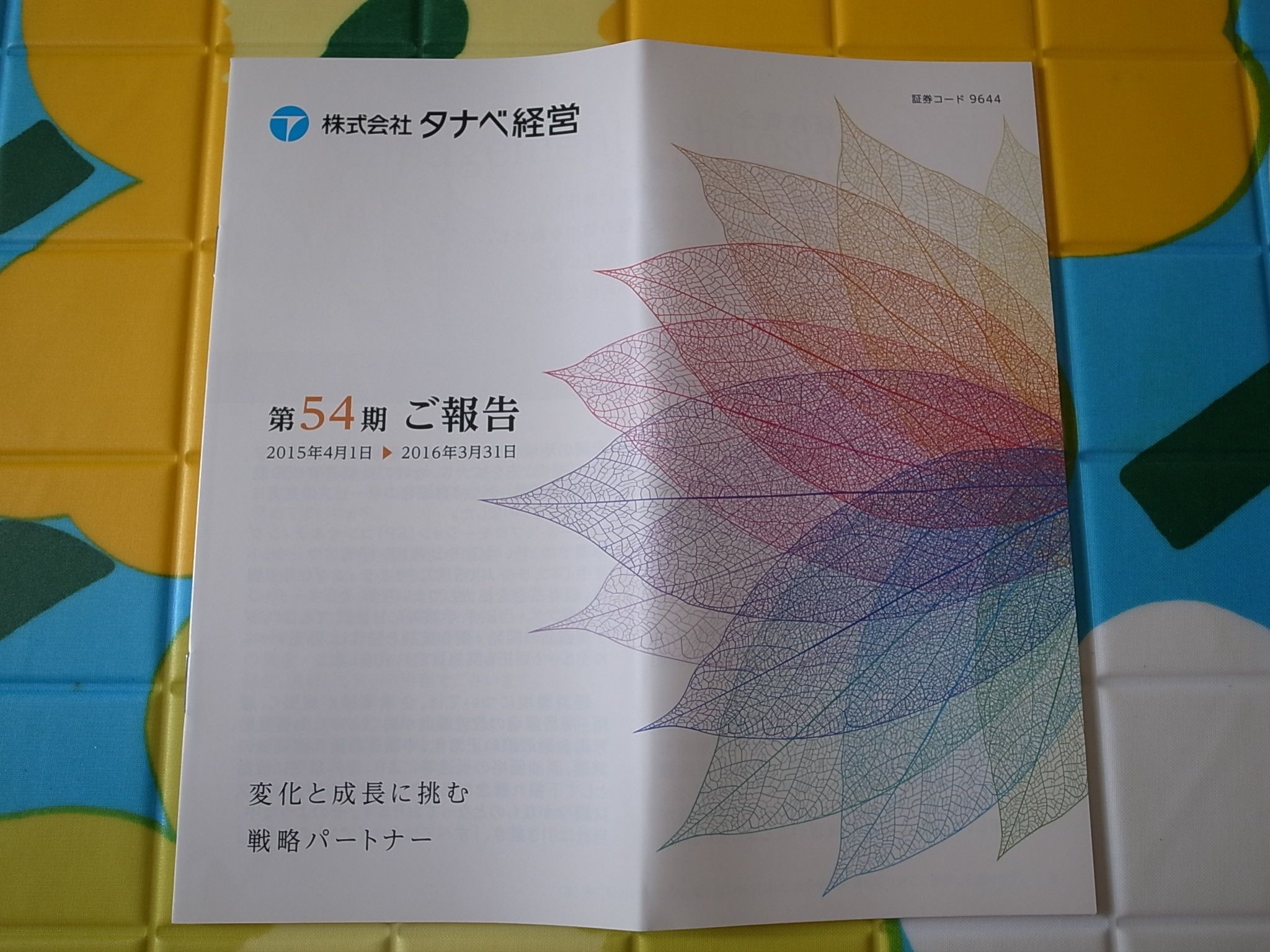 さて今日も通常のPF概況シリーズです。 422位 9644 タナベ経営 (東2、9月優待) △ PF422位は経営コンサル大手のタナベ経営です。 現在の株価は1236円、PBR1.09、株主持分比率82.5%で有利子負債は0、今季予想PER18.34、配当利回り3.2%(39~40円)、総合利回り3.6%(39+5=44円、優待品はヤフオク平均落札価格の500円で換算)で、優待は100株保有で3000円相当の「ブルーダイアリー手帳(オリジナル革表紙)」です。毎年のことですが、実に品質の高い手帳ですね。 タナベ経営は財務状態が良く、また配当性向60%で株主還元にも積極的なことから、ホールドしていくのに格別の不満はありません。これからも現行の優待制度が続く限りはのんびりとホールドして応援していく予定です。
