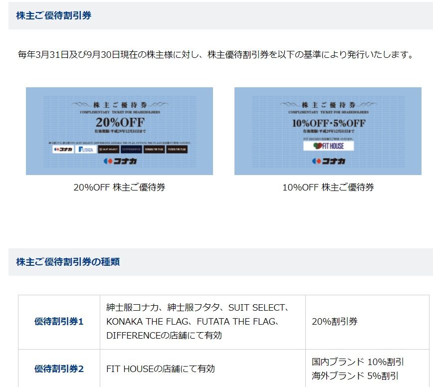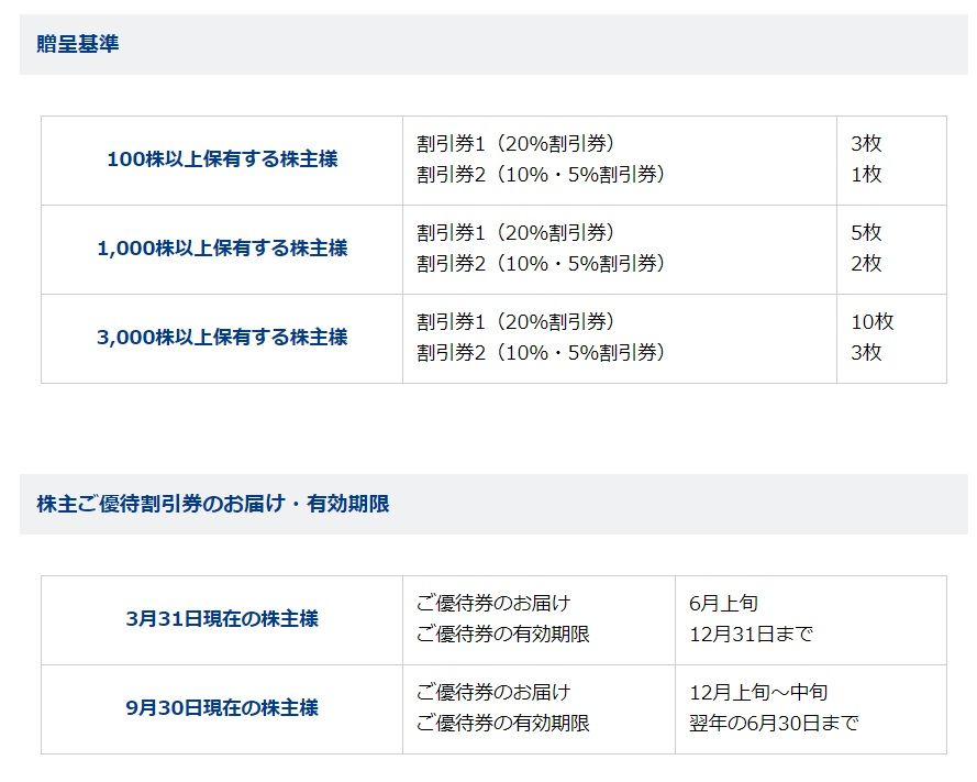 現在の株価は464円、時価総額139億円、PBR0.27、自己資本比率は64.7%、今期予想PER20.13、配当利回り4.5%(20円)、総合利回り10.8%(20+30=50円、100株優待1セットのヤフオク平均落札価格は1500円。)で、優待は年2回下記の通りです。​