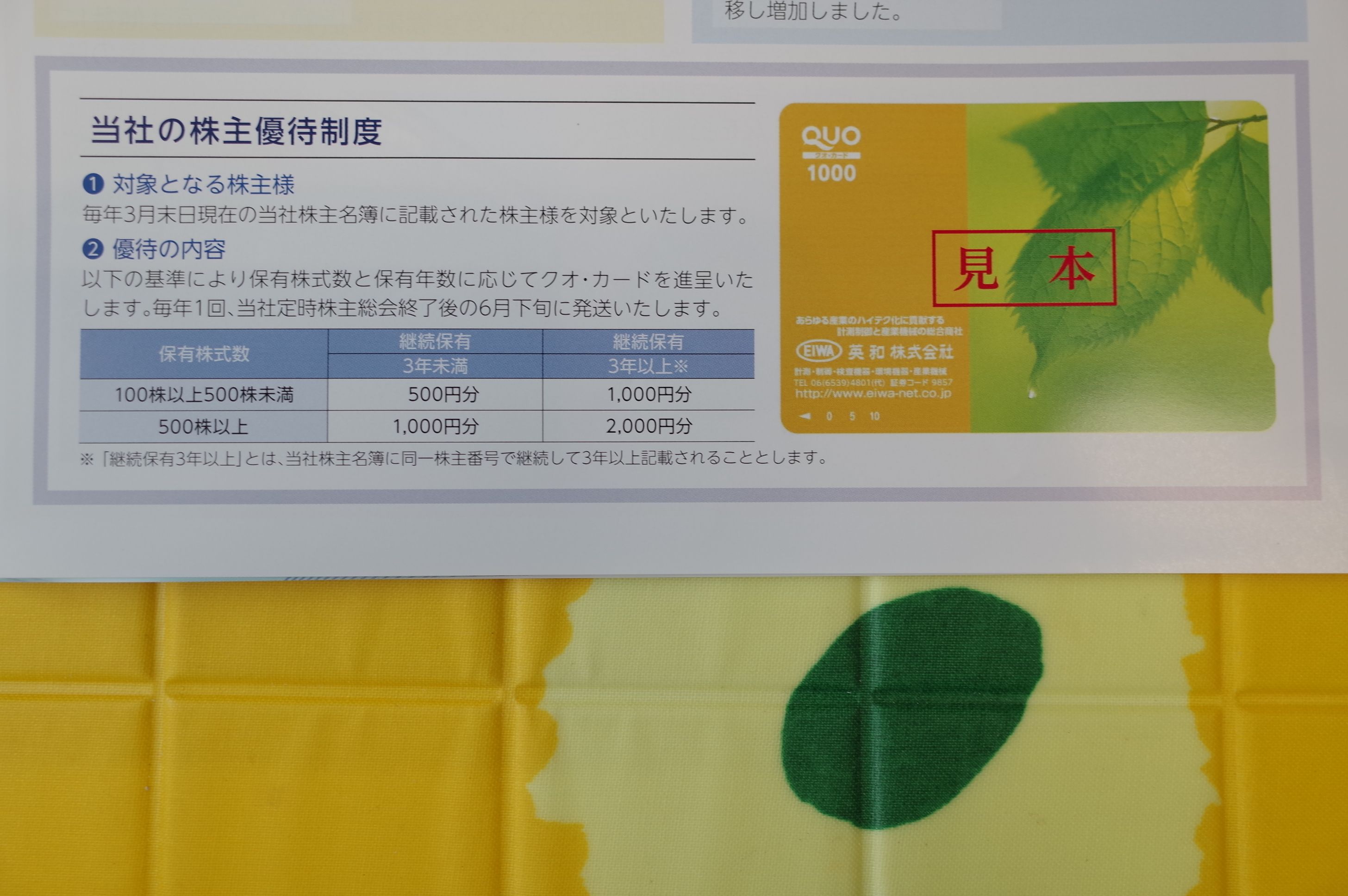 現在の株価は900円、時価総額58億円、PBR0.60、自己資本比率は45.4%、今期予想PER7.12、配当利回り2.9%(26円)、総合利回り3.4%(26+5=31円)で、優待は100株保有で500円相当、500株保有で1000円相当のオリジナルクオカードです。尚3年以上継続保有の場合、金額は2倍になります。
