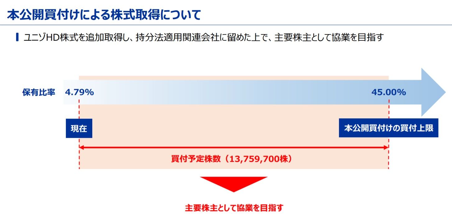 ただ、エイチ・アイ・エス側は45.0%を買付上限に設定しており、ユニゾHDを持分法適用会社に留めた上で、主要株主としてシナジーの発揮を目指す予定です。