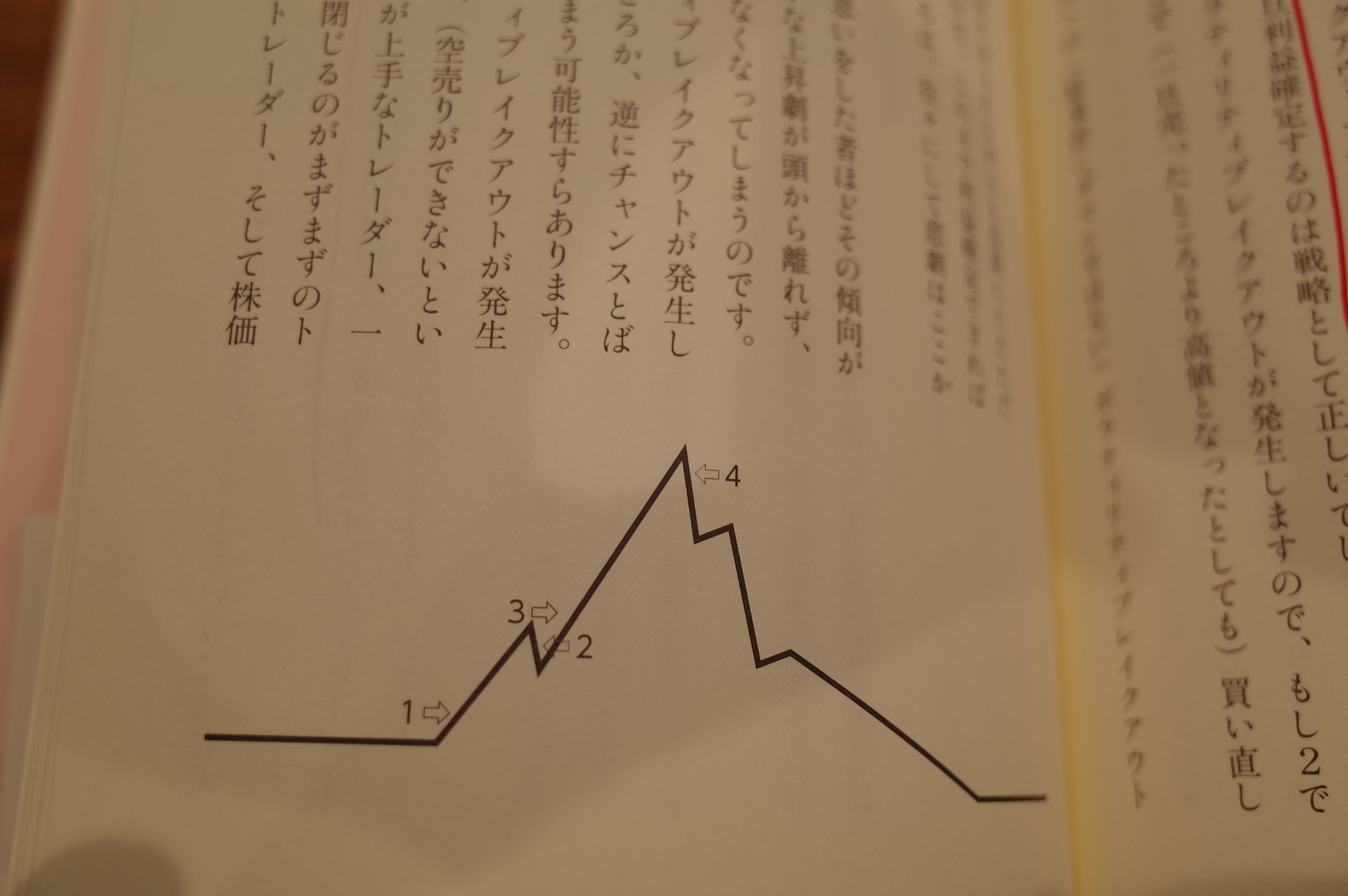 一つの大相場を演じる株の典型的な値動きですが、1では非常にわかりやすい上方向へのブレイクアウトが起こっています。ここは上手いトレーダーが買いを入れてくる絶好のポイントでもあります。また既存のホルダー側としては、これまで株価が動かないことに苛立っていた場合、1で早速やれやれ売りをしてしまう可能性が非常に高いと思われます。(上級者であればいよいよ上昇局面がスタートしたと見て買い増しをしてくるでしょうが)。