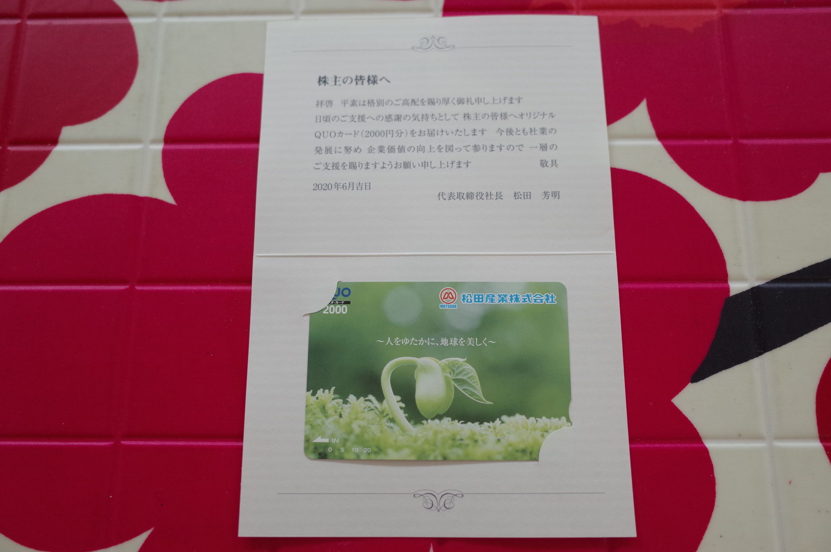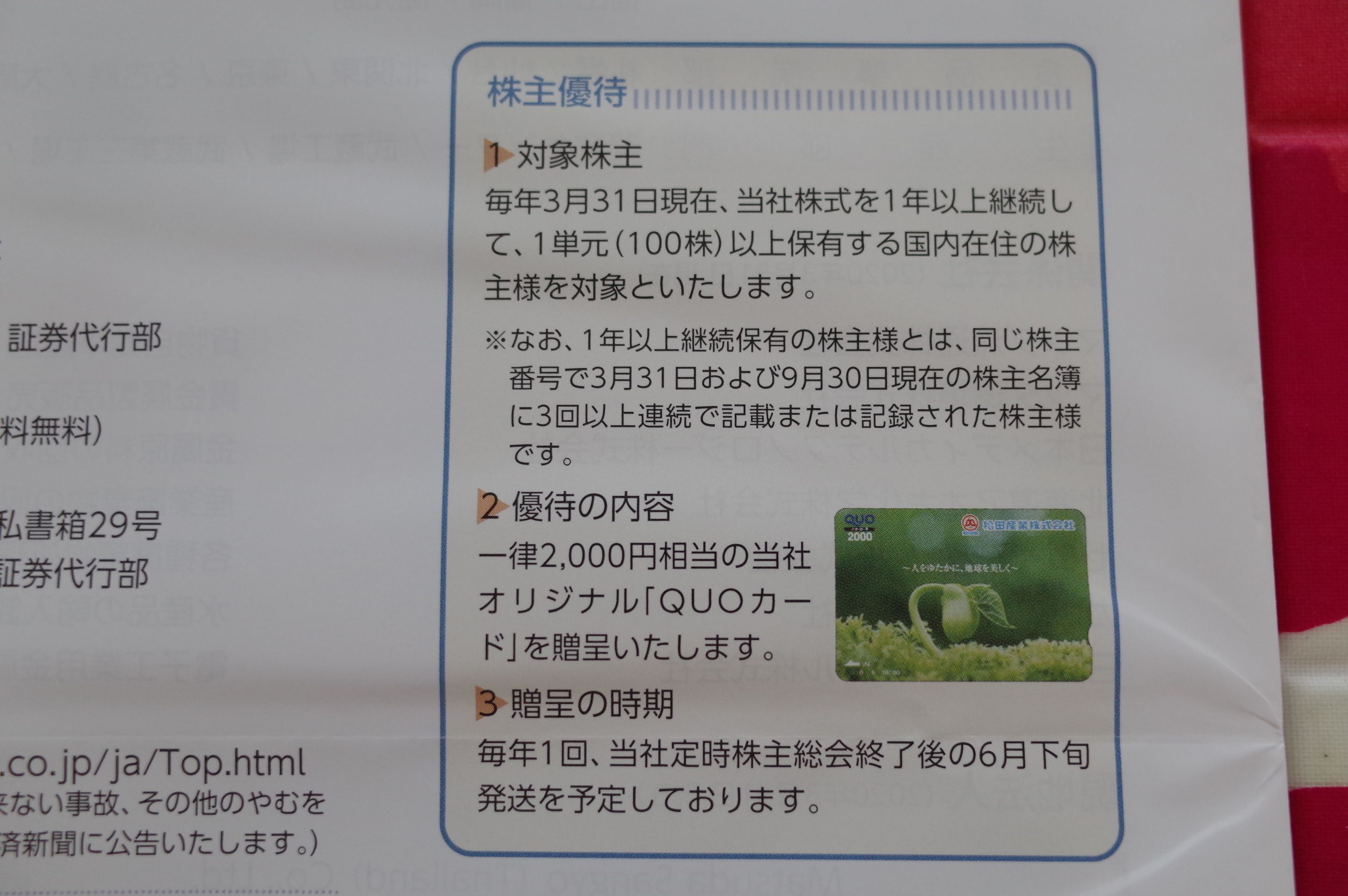 現在の株価は1673円、時価総額483億円、PBR0.73、自己資本比率は64.5%、今期予想PER11.41、配当利回り2.2%(36円)、総合利回り3.3%(36+20=56円)で、優待は100株保有で1年以上の継続保有を条件として 2000円相当のオリジナル・クオカード です。
