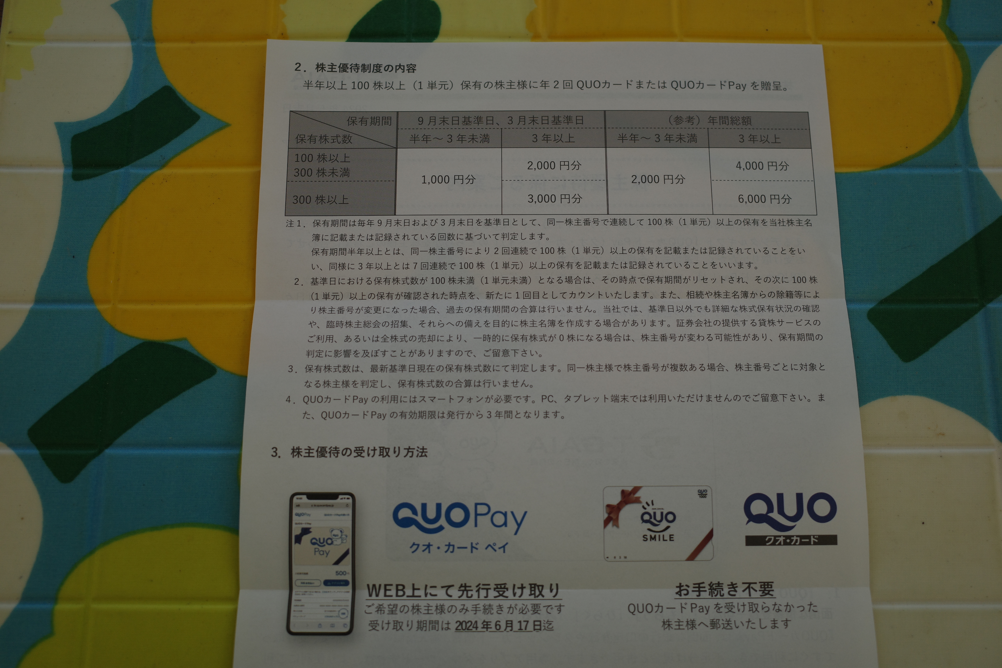 現在の株価は3135円、時価総額1758億円、PBR2.26、自己資本比率は31.2%、今期予想PER21.89、配当利回り2.4%(75円)、総合利回り3.0%(75+20=95円)で、優待は6か月以上の継続保有を条件として100株保有で年2回1000円相当のクオカード等です。