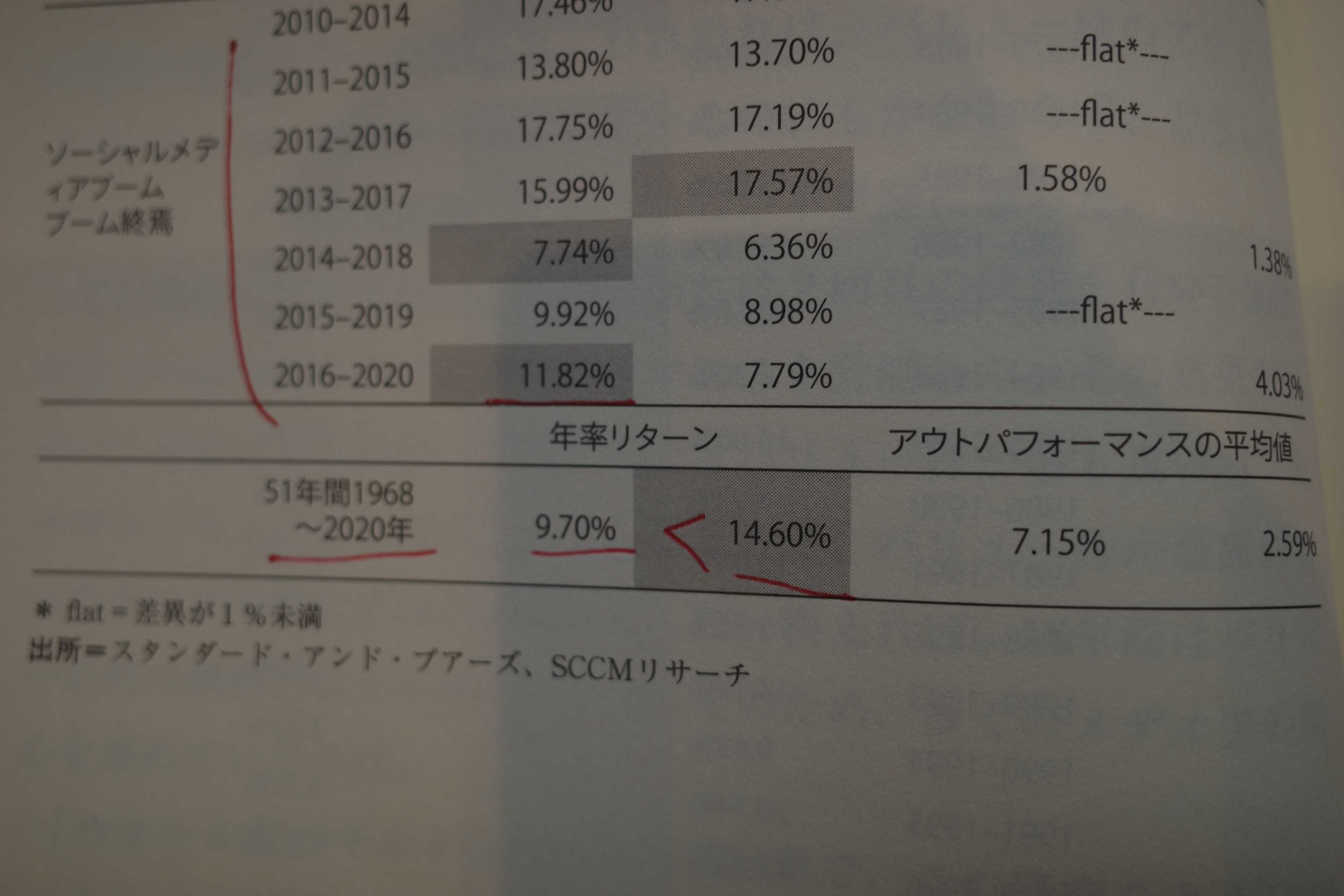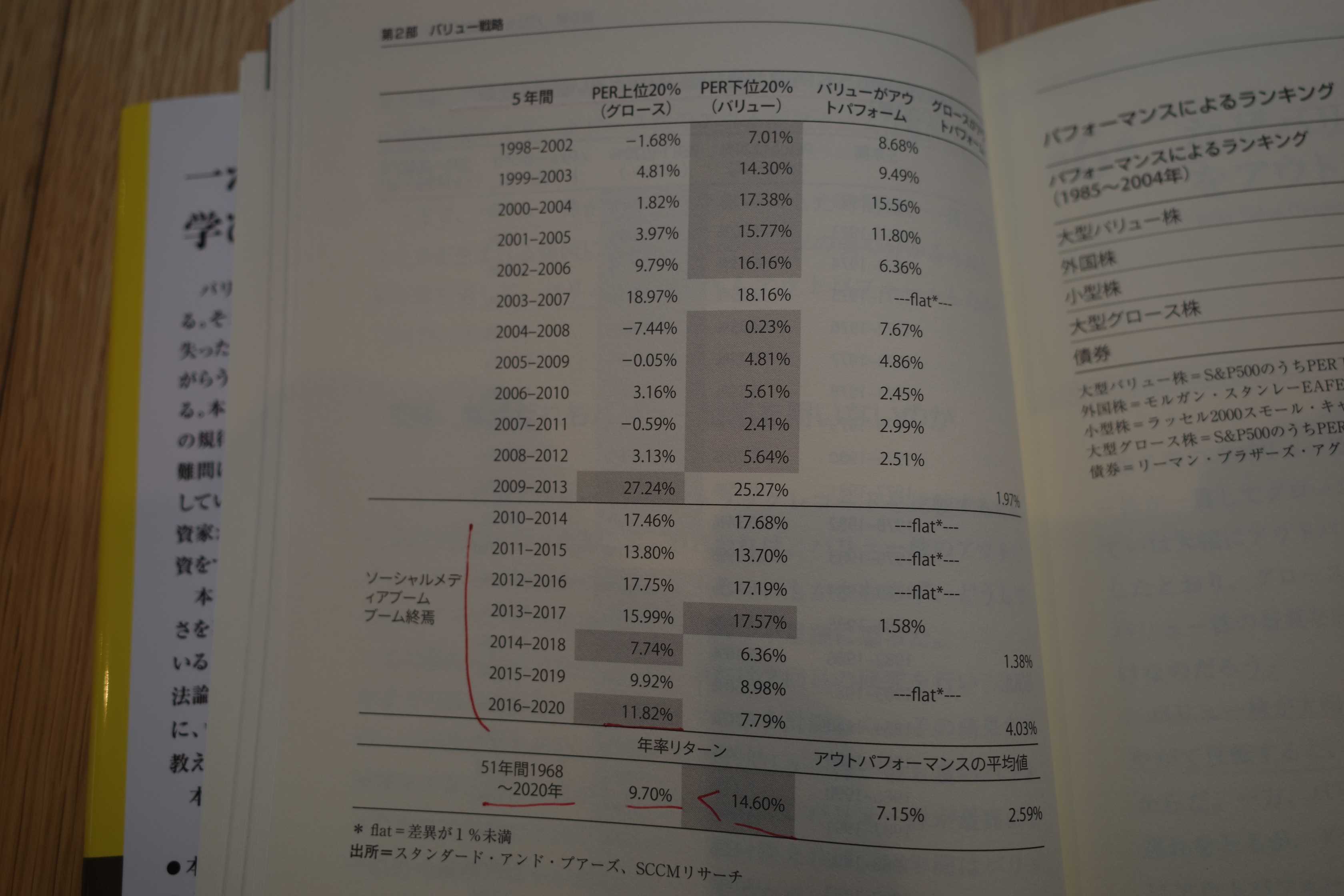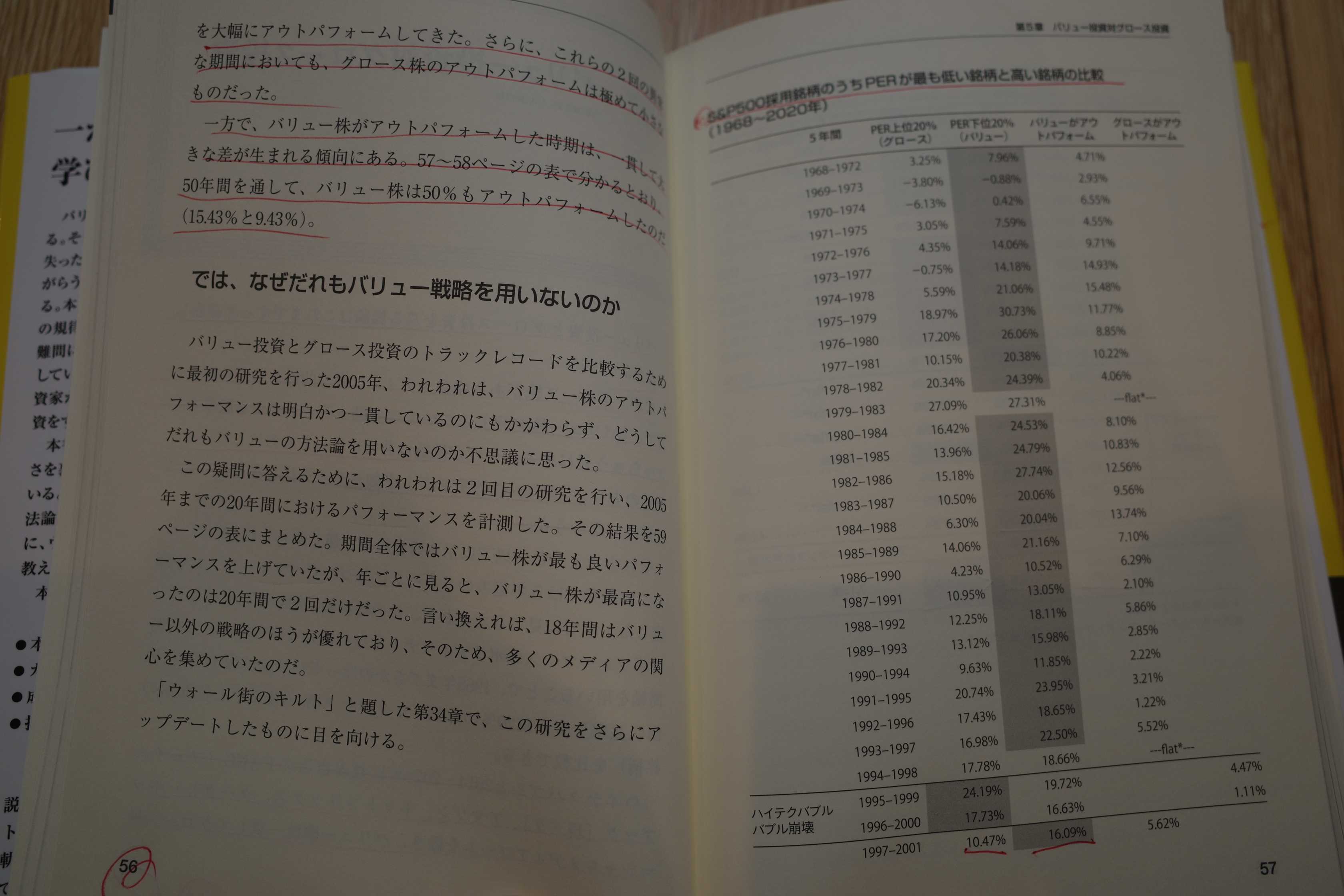 さらに、これらの2回の異常な期間においても、グロース株のアウトパフォームは極めて小さなものだった。一方で、バリュー株がアウトパフォームした時期は、一貫して大きな差が生まれる傾向にある。57~58ページの表で分かるとおり、50年間を通して、バリュー株は50%もアウトパフォームしたのだ(15.43%と9.43%)。