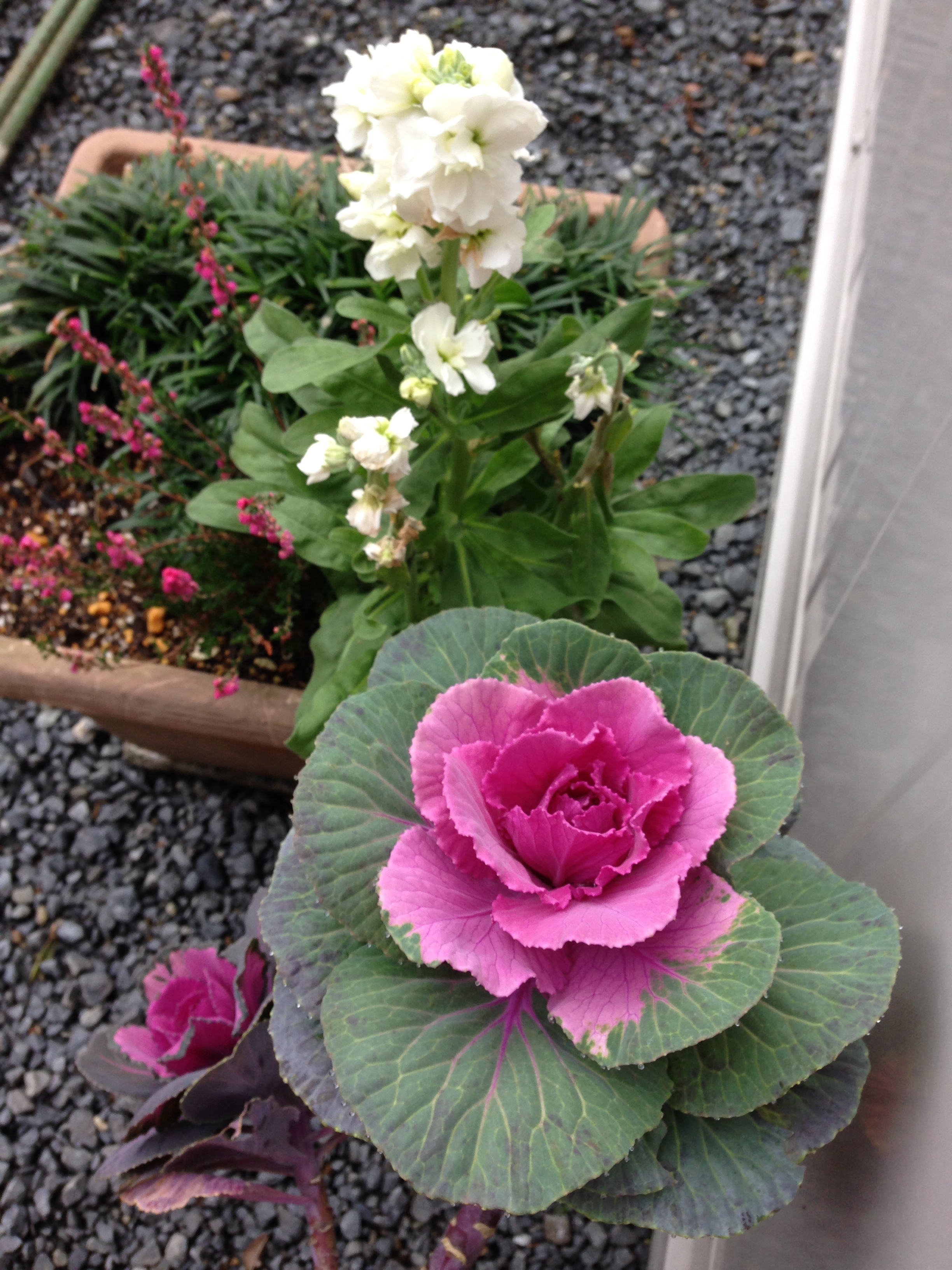 白いストックと去年の葉牡丹♪かなりの大輪です。