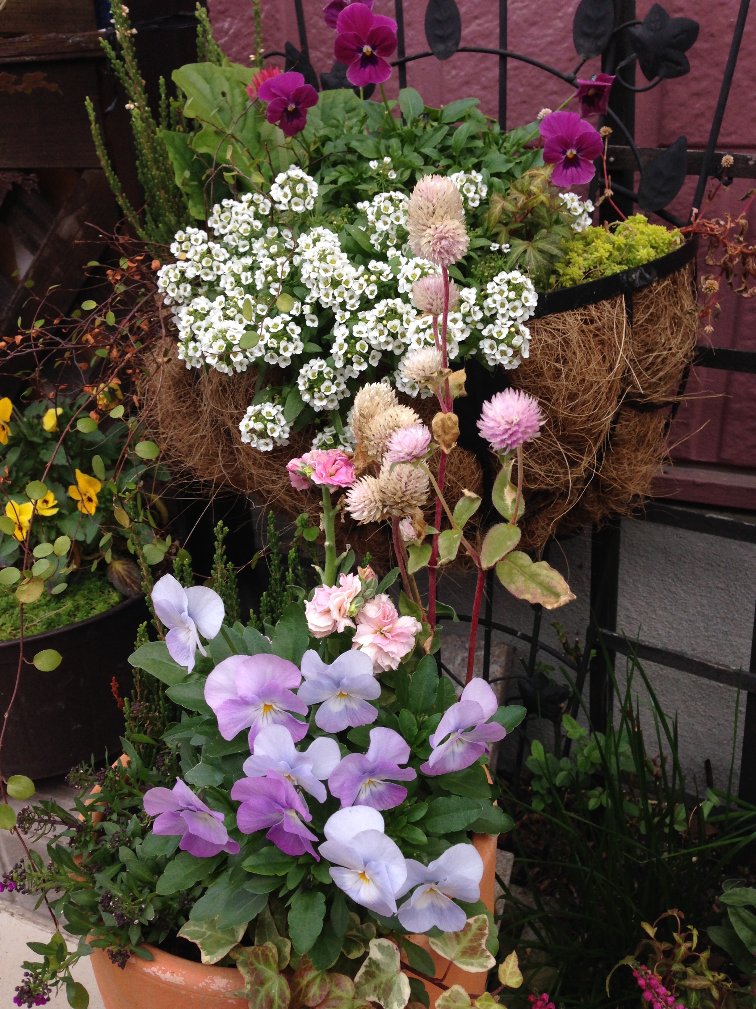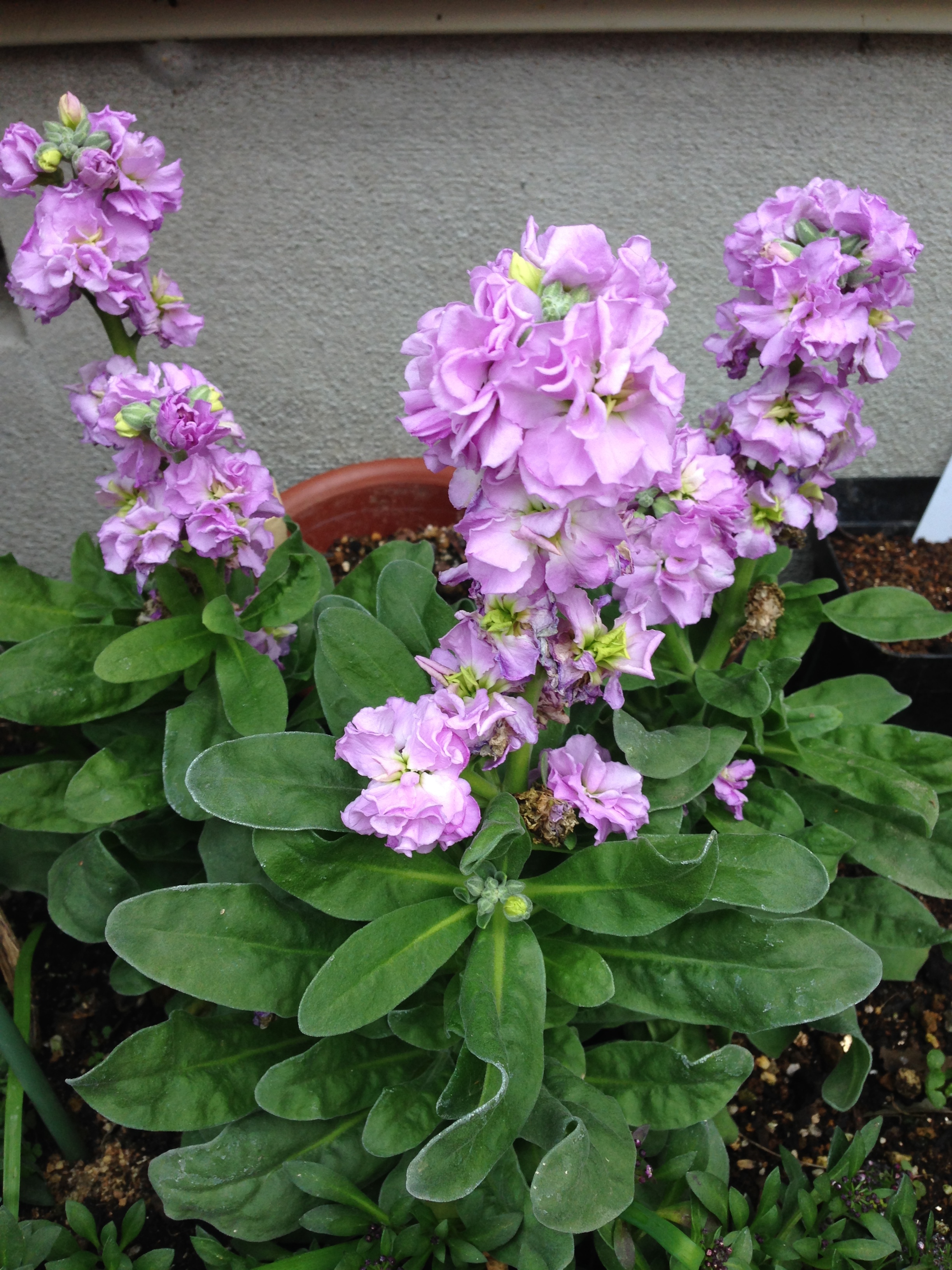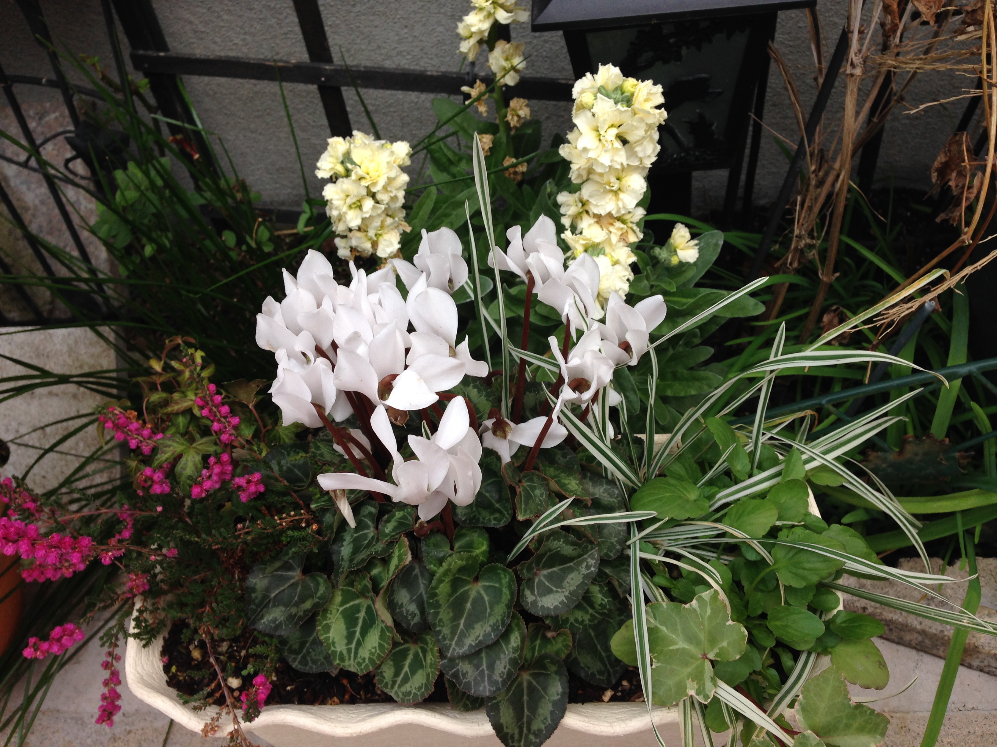 淡い黄色のストックと手前はシクラメンの寄せ植え。