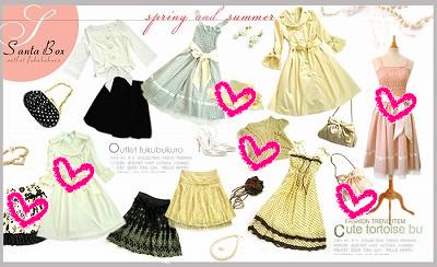 「サンタのアウトレットで欲張りさん福袋♪【春夏版!】 2007」買いました。「リボン大好き」コース選択で。ゥ─σ(・´ω・`*)─ン…冬の時が大当たりだったから買ったんだけど…正直、「気に入った!」ってのが1つもない結果に。 (´;ω;`)ウゥゥ凹むわぁ。(付いてるのが、あたしが届いたものです。)では 画像と感想いってみます。白い春コートです。ってゆうか… 凄いしわが付きやすい素材。すでに結構しわしわ。こまめにアイロンする性格じゃないのでしわが付く素材は苦手…。きっと着ないなぁ。《交換希望》 きゃ…きゃわぃぃ!!!可愛すぎて着れない!!笑着てみたら「ゆうこりん」??って感じになっちゃった旦那に笑われそうだぁー。《同じサンタボックスのグレードットワンピと交換希望》これは、可愛いから入ったら良いなぁと思ってたんだけど。丈が短いの。履いてみたら思いっきり膝上!!ちなみに身長161~2です。どうしよう… 着るかなぁ。《交換希望?(良いお話があれば)》これは…どうしよう。本当にかぶらない。いらない… 苦笑《激しく 交換希望》アクセサリー。この写真で見たら可愛いなぁ。でもね、実際はすごく安っぽいの。 あと、撮り忘れたけどピンクのリボンのバッグが入ってました。これもすごく安っぽいけどね…。はい。こんな内容です写真と同じのばっかり入ってきたけれど、実際に見てみると全部 若すぎた…。あたしと同じ年でも 子どもが居ない人なら普通に着れると思うんだけど、子ども抱っこしながらはちょっとキツイ服達ですね。楽しみにしてだけあって悲しいよーー・゜・(PД`q。)・゜・ 《交換》って、した事無いのですが希望者がいらっしゃれば 交換したいと思います。(*´∀`σ)σ