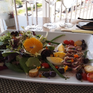 マリポサはアラモアナにあるニーマンマーカスのレストランです。デパートの中にあるレストランなので安くないけど、テラスの席はランチに気持ちよくてサンセットを観ながらのティータイムもおすすめです家族で来たときにママが気に入っていました。サービスでだしてくれたサラダ☆コーヒーに付いてくるチョコレートは中にミントが入ってて美味しいよ~
