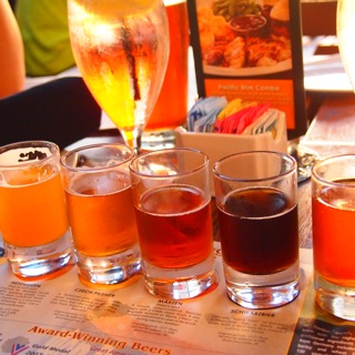 ロミロミのテストも終わって、みんなでハワイの地ビールを飲みにアロハタワーの“Gordon Biersch”へたくさんのビールの中から、ききビールセットみたいなやつを見てけて、それを頼みました。同じビールでも味も色もいろいろだね!この中から気に入ったものをもういっぱい頼んだ時にはもう酔っぱらっていましたご飯も美味しいし、サンセットも見えるので、ビールが好きな人にはお勧めです