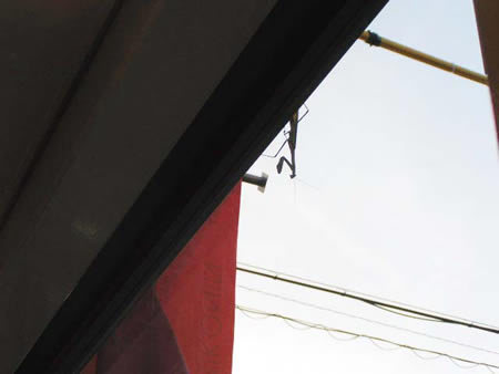 ちょっと!!!さっきから止めてよ!さっきから1時間以上はそこにいるんじゃない??気が散るからそろそろ帰ってよ!!!だいたいカマキリとか虫はきらいなんだから~昨日は↑が来てるし。。。。後片付けする前に帰って