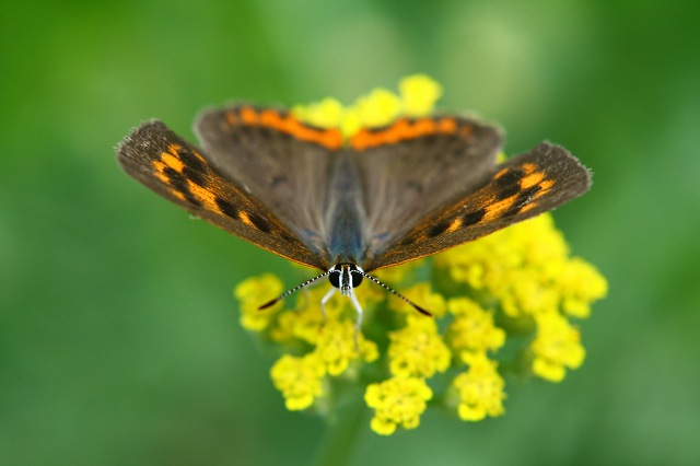 あっしが、飽きもせず紅シジミだす。と言うのもこの蝶は写真の初心者にはピッタリの蝶でございやす。あまりチョコマカと動きません。近寄っても、もっと寄ってらっしゃいよ!てな感じで御座います。あっしが、その紅だす、可愛いでやんしょ、お目目パッチリ、ブチの付けまつ毛オホ!ソフトフィルター付けてみました。良い感じかな?今日の真昼間ですこのマリーゴールドにずっと居ます。我家の子に成ったような・・・二匹も来て遊んで居ます。今日は午後からすっかり青空となり、また群馬は日本一の暑さに成ったのではないでしょうか。汗拭きの日本手ぬぐいが、離せそうにありません。パソコンの椅子の下からは悠悠(ゆうゆう)のいびきがグーゥウ!グゥ~等と聞こえてきて居ます。涼しくなったらお散歩かな?