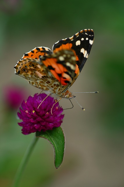 まず友人の畑の千日紅に姫赤タテハ蝶が来てるかなと見に行く。今朝も来てる来てるでカメラを取りに帰ってくる。何時間もこの蝶は千日紅にヒラヒラと居るんです。此処3.4日そしてちかずく時は、蝶に話しかけるんです。又今日も写真撮らせてね。・・・って今日はこんなところにも、じっと長く居るから、早くお花に止まってよと言いましたよ花と蝶 半分こで助け合って、面白いでしょう どうでしょうこのお顔は羽根に似合わず獰猛そうですね・・・・今日は羽根開き気味だから綺麗でしたよ。蝶にね、うんうん綺麗よって言うんですよそしたら上手く取れるよと、ネット仲間の大和さんに書いたら「それは勘弁してよ!」ですって はははこれ顔を上げてう~んと頑張って吸蜜中です白い千日紅もあるんですが、どちらかと言うと赤がお好みみたいです。下にはイチモンジセセリも一緒に吸蜜中です。長い時間居ると仲良くなって、カメラを置いて、今日はありがとうそう言って止まってる羽根を触らせてくれましたよ。私もびっくりしました。蝶の羽根何度かなでなで出来たのよ。ほんとよ感激でした。初めてです。