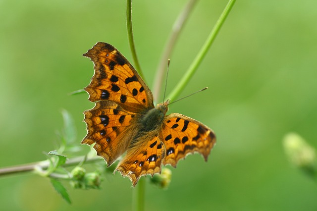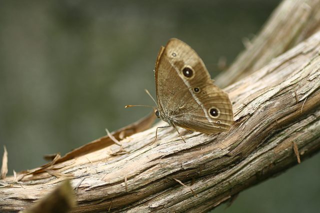 まだ羽根も綺麗だしキタテハを追っかけました。コシロノセンダングサは蝶たちの大好きな花のようです。セセリチョウ、黄蝶、モンシロチョウ、シジミ蝶、そしてこの黄タテハ蝶が賑やかに飛びまわって居ます。まだ羽根も綺麗で生き生きして居ます。これが羽根を閉じた所です.枯葉みたいですね羽根を広げると綺麗で目立ちます。この乗っかってるのがコシロノセンダングサ(後にくっつき虫となる雑草です)二匹遊んでいました。あと少しするとこの花の中へ足を踏み入れる事は出来ませんが、今ならまだくっつき虫に成ってないので平気です。真正面からです。家の庭には ヒメジャノメ蝶 が来て居ます蝶の目って色々あって変わってますね。紋黄蝶はグリーン、モンシロチョウはブルー、ヒメジャノメは茶色ですね。紅シジミ蝶は真っ黒のクリクリお目目に白のマスカラやっぱり蝶は手持ちで追っかけるので、手持ちが上手になります。