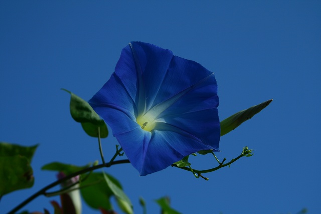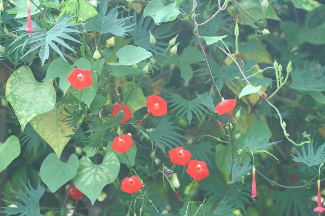 今朝は少しきりがありましたが・・ブルースカイとなってくれました。ブルーの朝顔にブルースカイです。と言ってもこの色だけ、今少し赤いのが咲き始めそうですが・・・それが小さな花のようです。名前は、「ガーディナル・クライマー」なんて書いてあったのですが・・・昼顔の仲間ですって・・・なるほどクライマーだけあってあそこ、ここ、といろんな所に巻きついて居ます。この通りです。今これにアブラムシ大発生、木酢、を掛けましたがスミチオンにしようかな?近くに コデマリ が有るのでそれのを、もらったのでしょうか。二度目のむくげが咲き始めました。むくげはアブラムシは大丈夫のようです。気候が変だから今頃ね・・・・・参りました。