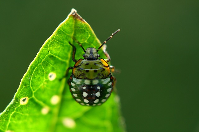 今日茄子の中にミナミアオカメムシ4齢の6ミリくらいかな幼虫発見葉っぱごと家に連れて帰り撮影しました。4齢です臭いはしませんでしたよ。チョコマカと動き回るのでたいへ~~ん・・・5・6ミリです横から見るとメタボ風ですねぇ~、大豆や茄子が大好きのようです。写真を撮るようになってから、いろんな事に目が行くようになりました。綺麗なお花は咲いてるかな?珍しい虫や蝶は居ないかな?とか・・・・とことん生態を観察してみる。楽しいですねぇ~