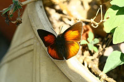 朝表に出た途端こんな蝶に会いました。始めてみる蝶です名前も解りませんこれ羽根を閉じた所足が短いなぁ~蛾の様な感じもでも綺麗でしょう暫くわがやの近くで遊んで帰りましたが・・・・なかなか羽根を広げてくれません。やっと広げた所ゲットです。何と言う名前でしょう御存知の方教えてね今朝は爽やかだったので我家も賑やかでしたよ。こんな子もやってきますカメラとゴミ袋(ごみ出しの日)抱えて忙しい事・・・キチョウもやってきてみつを吸って居ますモンシロチョウのオリボンも・・・イチモンジセセリも、写してくれと、うるさいんです。この子は・・・・ぎりぎりセーフでごみ出しです。あぁ~急がし!