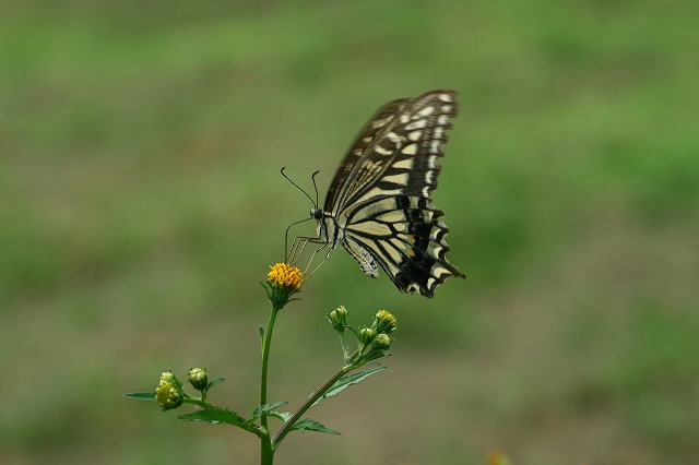 今年もずっとアゲハ蝶が撮りたくて・・・なかなかチャンスなくて・・・それが今日昼過ぎ我家前の道端に”コシロノセンダングサ”が一杯に成ってるんです。こんなに一杯で、どうなりますかね。花が終わればくっつき虫に成っちゃうのに・・・なんて見てると、やってきました。アゲハ蝶しかも 黄アゲハちゃんです。丁度カメラも持っていました。ゲットできましたよ。見てくださ~い!この「コシロノセンダングサ」は蝶が案外好きな花です。(シャッター速度1/200絞り6.5)こちらはシャッター速度1/250絞り6.5です普通の蝶よりアゲハ蝶は羽根を動かす速度が早く、シャター速度は早くしました。(上もこれも、全部トリミングしていません)あげはちゃん少しの間でしたがラッキーでした。ついでに蜜蜂君も撮りました。暖かそうな毛が一杯ですね。足には花粉玉を付けて・・・これは友達から戴いたミセバヤです綺麗に咲きました。このイチモンジセセリ蝶は写真に撮って欲しくて寄ってきます。可愛いかな?最後に我家の虫に食われちゃった薔薇咲きました。何だか蜜蜂も蝶たちも忙しそうでしたよ。