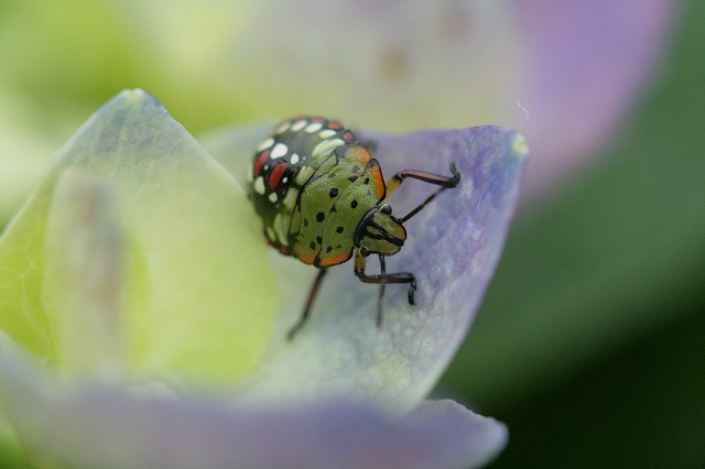 今年も出ました。ミナミアオカメムシ4齢 幼虫です6ミリ位でしょうか今朝早く小雨の中紫陽花の花の上で ドッコイショ! ヨッコラショ!背中の模様が 四齢の証拠 おっとっと おっこちるよぉ~ グイと力を入れて・・・・あちこち ちょこまかと 忙しいやつなんです交換レンズ タムロンマクロ90+拡大NO3フィルターです 手持ちなのでほんの少しカメラや体がぶれるとピンボケです。没写真が一杯です。うぎゃぁ~こんな草も小鳥が持ってきたのでしょうね ピラカンサの根本に始めは手を出すのさえ おっかなびっくりでしたよ。植物もすごいなぁ~最後にもうそろそろ 咲く準備をしてる我が家の 矮性ひまわりです。私も蝶や虫が好きですねぇ~自分でも呆れて居ますが・・・朝降っていましたが今は雨は上がって居ますが蒸し暑い日曜日です。
