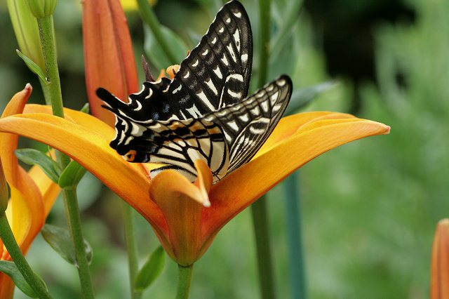 我が家のゆりにアゲハがやってきました。この私の事家にカメラを撮りに入りそれからが大格闘???です運悪くゆりの蜜はロートの下のほうなんですねぇ~他の花に止まったようには行きません、羽根だけしか見えなくなるんですこうなんですよ・・・これではねぇ~・・・それでやっと頭を持ち上げた所をパチリ!やったぁ~と思いましたら羽根が(上)少し切れて居ます、ゆりに来る蝶は、奇麗に撮るの難しいと思いました。もぐるんですもんねキイロノコギリソウに移ると・・・写しやすいですぅ~お利巧さんと言ってやりたいくらいです私に追い掛け回されてもユウユウと遊んでいきました。又おいで!いや来ないでも良いかなもう少しすれば産卵に来るんですもんね・・・ありがたくないのよ・・・・昨日の矮性ひまわり今日はここまで開きました。これは昨年の種を20粒位蒔いてたった一粒だけ芽を出したのです。後の19粒はどうしたんでしょう?芽が出ませんでした。だから余計に可愛いんです。これは今撮りたての写真友達の花畑に、行くと黄色のキクイモの花に黄蝶です、私をにらんで文句言ってるように見えませんか 「何か用なの?うるさいわねぇ~」てな感じかな?暑かったですちょっとの間なのに、汗が流れて来ます。帽子に長袖のブラウスに手ぬぐい、と用意はするのですがこの暑さはねぇ~