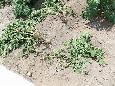 何だか変な世の中になりました。2.3日畑に行かなかったのですが、今日主人が出かけてきて、ジャガイモが盗まれてる。との事で私も見に行きました。こんな感じで5箇所もやられました。他の方の御近所さん達見て回ったのですが今日の被害は我家だけです。まだ小さいから、あと少し置いて6月中旬収穫・・・と思っていたところですが、持っていかれました。まぁ~盗んで食べないと駄目なほど、困ってる方なら、差し上げても言いのですが・・・悔しいですよね、あと少しと言うところまで育てて・・・・何年も作って居ますが初めてです。道路を隔てたお隣さんの栗畑です。広瀬川の土手下ですこんなに静かな場所なのに・・・・栗の花ですがまだ蕾みで開いていません畑からの帰り、御近所に咲いていました。野いばらのような感じでしたが可愛い色です~~~~~~~~~~~~~~~~~~~~~~~今日は民謡練習の日・・・唄って来ました
