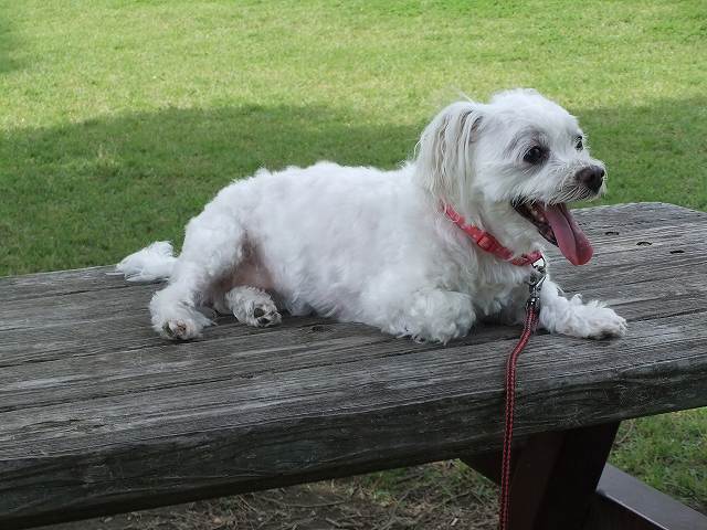 今日の暑さにバテバテの悠悠です。朝9時半頃散歩に連れ出しました。まぁ~もう暑い事 暑い事!悠悠バテバテです公園の木陰だって 暑いです・・・・ハァ~ハァ~菊チャンの真似をして、私がカットシャンプーしました。7千円倹約・・・・悠悠ちょっと段々は我慢しましょうね・・・この厳しい時だから・・・UPにすると段々がバレますね・・・はははそのうちに丁度良くなるさね・・・・・「ほんとにそうかなぁ~」 まぁ~お顔の周りはもう一回少し仕上げをしましょうね!ここから 動きたくないんだ・・・・あれ?少し風が吹いてきたよ・・・凄い暑い日だ、早めに一回りして帰って来ました。