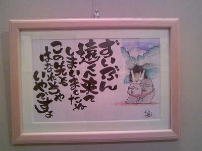 今日は先日有った作品展でのお友達の作品を紹介してみます。色んな事をしてる方がいらっしゃるのねぇ~(全部携帯写真です)これを書いた方の気持ちと、私の気持ち・・・よくにてるから・・「ずいぶん遠くへ来てしまいましたね、」その次は今は、あまり重視しないのですが ははは今は一人が良いですから・・・・こんな作品を出してる方も居ました おいしそうな果物この作品には、私も足が釘ずけになりました。御主人がチベットの方を旅してきて写してきた写真を、見ながら奥様が描いたのだそうです。良い雰囲気ねぇ~60号位かな?大きかったです。子供の目が生きて居ます。これは押し花の作品ですA3サイズでしょうか奇麗でした。皆さんの色々の作品を見て元気が出てきます。