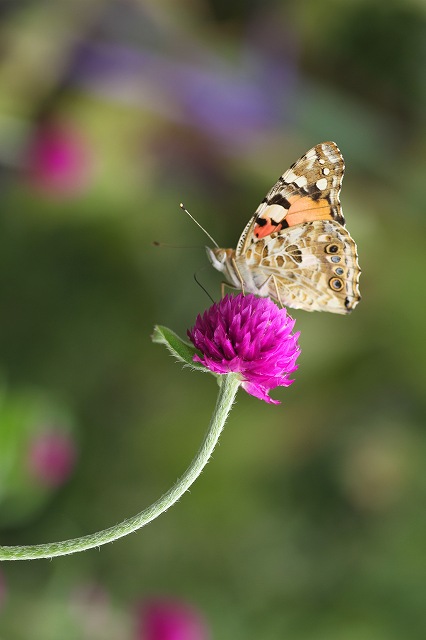 今日は蒸し暑い日でした、友達の花畑に 姫アカタテハ蝶が来て居ますカメラを取りにもどって・・・仲良くなる。最後の方は 羽根とかお尻を指で触ってもじっとしてるんです。去年もそうでしたが、姫アカタテハ蝶は、一番人懐っこい蝶です。そぉ~と指を出すと今日も片足くらい乗せてくるんですよ。可愛いやつ・・・・・顔は中々精悍な顔はしてるんですがね・・・本当に最後の方は仲間みたいな感じで指を出したら足を乗っけてくれました。羽根もお尻も触らせてくれましたよ。(指は後ろから出してくださいね)この蝶(姫アカタテハ)以外は全然駄目ですが皆さんもこの蝶で試してみてね!ちょっと逆さまにも成ってみるか?見ててね!どうよこの羽根の色・・・千日紅が大好きのようです。白より 赤が好き のようですよ この子は ヒョウモン蝶 か ツマグロヒョウモンの♂ 我が家のミントの花が大好きです。尾羽が切れて居ますね。どんな戦いがあったのでしょうねツマグロヒョウモン蝶♂は用心深いですよ、シャッターの音にも反応します覗きで・・・蒸し暑い代わりに雲が有りましたので少々しのぎよかったですが明日は又予報によると、35度以上の猛暑とのこと、持つかなぁ~