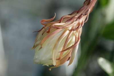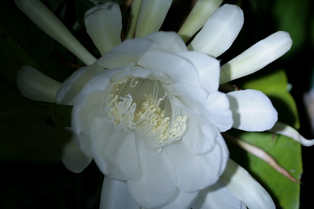 昨夜遅くに咲いてくれました。PM10時過ぎです真っ暗な中懐中電灯一個です。ストロボ焚いてみましたが、思うような効果が出なくて、昼光用の懐中電灯で、加減しながら・・・まだ開ききって無いようです。今夜は2輪です良い香りもぷんぷんしてきましたむせ返る様な香りですバックに懐中電灯を入れて、一人なので大変です灯りの強さを見るのが・・・欲張って、バケツを伏せて踏み台にして上の方から2輪ゲット、後でポリのバケツ少し曲がっていました。はははこれが日付け変わってAM1時頃です。バケツは凹んでくるわ、足首の出てるところ蚊の大襲来に合い、家に入ってから、かゆい事かゆい事、助けてぇ~とんだ月下美人ショーでした。お粗末!